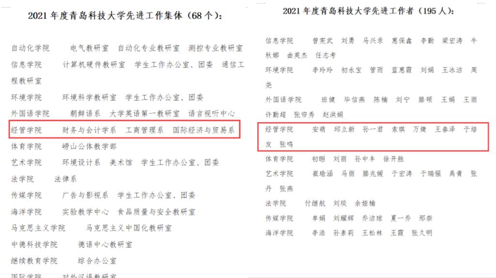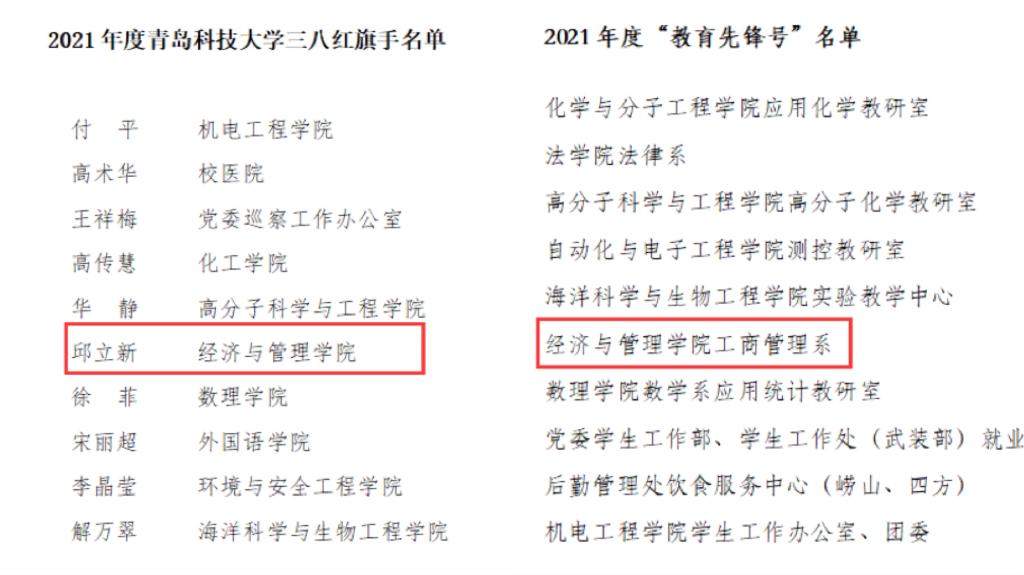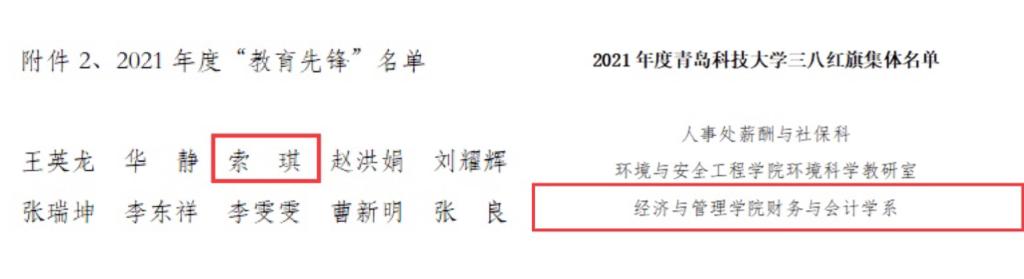 近日,2021年度熊猫体育先进集体、先进工作者、教育先锋号、教育先锋、三八红旗手、三八红旗集体评选结果揭晓,公司3个集体及8名教师在上述各类评比中均摘得荣誉,其中财务与会计学系、工商管理系、国际经济与贸易系获评校“先进工作集体”,安萌、邱立新、孙一君、索琪、万婕、王春泽、于培友、张鸣老师获评校“先进工作者”,邱立新老师获校“三八红旗手”称号,财务与会计学系获评“三八红旗集体”,索琪老师获评“教育先锋”,工商管理系获评校“教育先锋号”称号。