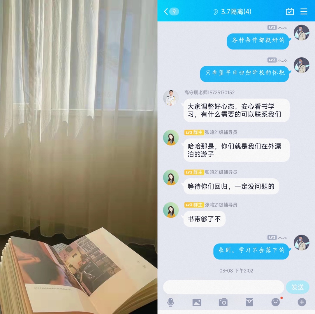 3月7日,按照公司既定要求,全体同学正在安心等待全员核酸检测的进一步通知。在焦急地等待中,辅导员老师的一通电话让我忐忑不安起来,由于某种原因,我可能需要采取一些“特殊”的措施。听到这个消息,内心不慌乱,是假的。脑海中的信息不断涌现,回想着自己的行程轨迹,想象着该如何和家人报平安,该如何让舍友安心,一切的安然瞬间被打破。“嘉楠,不要急,不要有心理负担和压力。”老师的几番话将我从游离中拉了回来,“你先收拾下被褥,高老师一会开车去接你。”“对了,不要忘记带书本和电脑”。