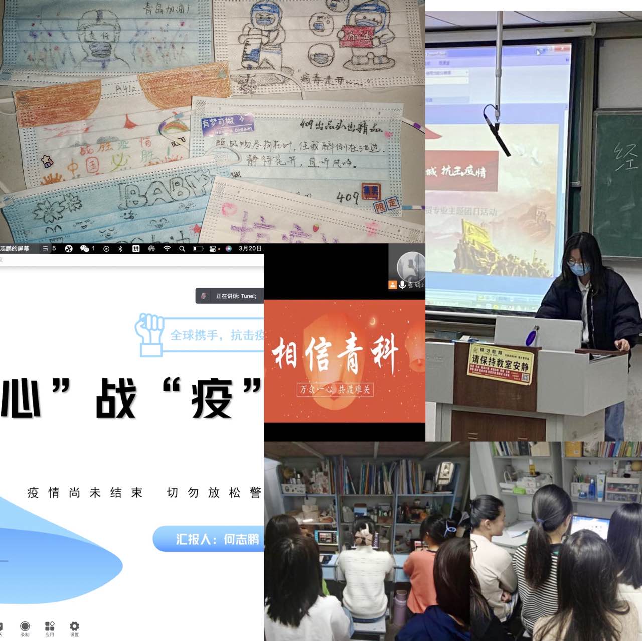 各专业团支部以共抗疫情为主题,围绕疫情防控开展主题团日活动。工业工程专业团支部积极响应公司和公司号召,以“最美志愿者”为主题开展团日活动,全体团员主动请战参与疫情志愿服务,主动牺牲休息时间,加入核酸检测志愿者的大军,当起了秩序组织员、管理引导员、设备操作员。一张张阳光的笑脸,一个个青春的身影,广大志愿者同学们冲锋在前、甘于奉献,彰显出经管学子的靓丽底色,为核酸工作的高效、有序完成贡献了青春力量。工商管理专业团支部以“花样抗疫”为主线,进行DIY创意口罩活动。全体成员以宿舍为单位,将普普通通的口罩通过绘画,贴纸,祝福语等形式进行美化。每一幅作品都是独特的,旨在寄托同学们抗击疫情的决心,加强同学们的疫情防控纪律,丰富员工的课余生活,并鼓励同学们保持良好心态,乐观应对疫情。城市管理专业团支部、工业工程专业团支部积极响应公司号召,本着不聚集、强防护的原则,线上线下同步开展观影活动。团支书首先通过ppt展示,给大家科普当前疫情防控形势、注意要点等相关知识并集中观看《中国战疫纪》纪录片,让同学们深刻明白人人都是抗击疫情的行动者,人人皆有爱,就能让病毒无处遁形。市场营销专业团支部通过腾讯会议召开“同心战‘疫’,共克时艰思想宣传教育”主题团课,进行了防疫、自我管理、心理调适、传播正能量等方面的教育引导,鼓励员工与公司一起,齐心协力,战胜疫情。活动结束后,团员青年们纷纷表示要树立疫情防控安全意识,积极配合校园防疫工作,凝聚集体意识,坚决抗击疫情。