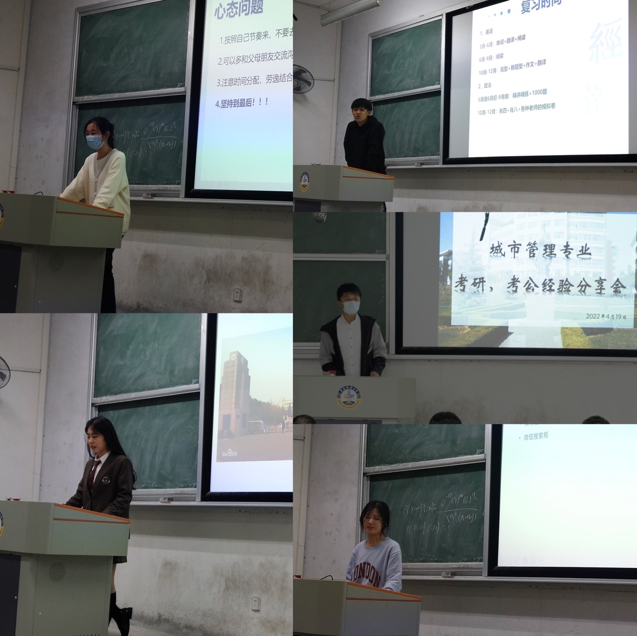 4月19日下午,熊猫体育城市管理专业于弘毅E102教室举办 “用努力成就精彩人生——2022届考研考公经验分享会”,本次分享会邀请了2018级考研考公成功的7位同学进行经验分享。分享会由城管系主任万婕主持,城管专业19级、20级、21级共150余名同学参加此次活动。