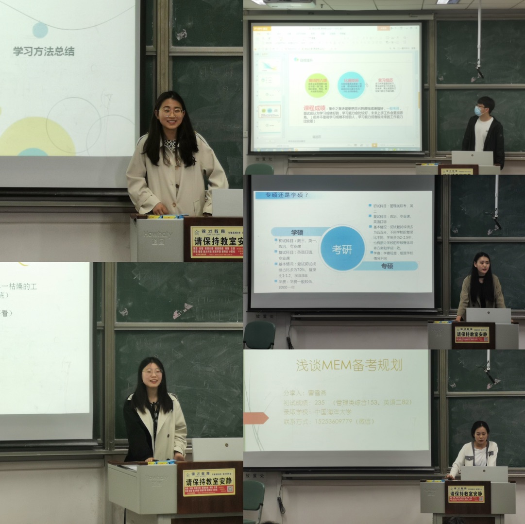 随后,学长学姐向在座同学做了自我介绍,并结合自身经验,与同学们面对面交流,并给出相应建议。曹雪燕(中国海洋大学)、王丽娜(河海大学)分别就考研时间安排、公司选择、参考资料获取、复试准备方面分享了自己的成功经验,并向同学们寄予希望;张亚奇(日日顺)、贾俊荣(顺丰)分别就找工作渠道、面试技巧、简历填写等方面讲述了自己成功的经验以及途中遇到的问题,帮助大家认清自己各种招聘的优劣势,选择最适合自己的就业方向;彭承琪(保研暨南大学)主要分享了自己保研的整个心路历程,并为大家推荐了非常实用的软件工具,同时鼓励同学们积极做好规划,不要盲目相信机构,自己才是最棒的那颗星。