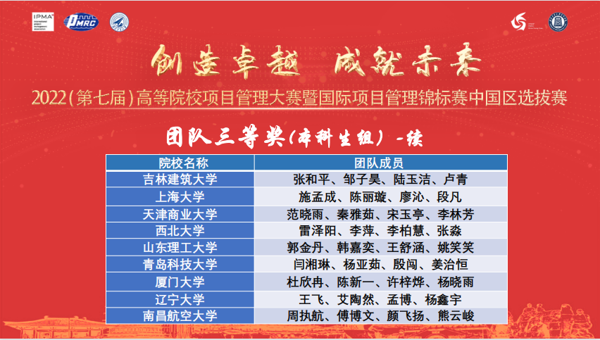 据悉,大赛已经成功举办六届,国际项目管理锦标赛(Project Management Championship)是全球成立最早且最具影响力的国际项目管理专业组织——国际项目管理协会(IPMA)主办的面向全球高校员工的全球性项目管理创新性竞赛。全国高等院校项目管理大赛作为国际项目管理锦标赛的中国区选拔赛,本届大赛遴选出熊猫体育、西北工业大学、桂林电子科技大学、中国石油大学(华东)、石家庄铁道大学、北京邮电大学、北方工业大学、清华大学、昆明理工大学、北方工业大学十支团队(分别有本科生组和研究生组),进入英文资格预选赛,具备条件的,将作为中国代表队参加国际项目管理锦标赛。