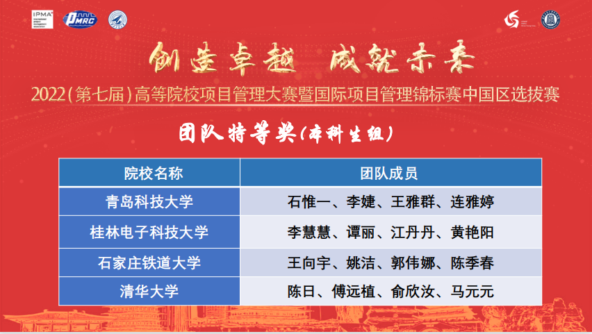 其中,由董华、黄天赐老师指导,石惟一、李婕、王雅群、闫湘琳、连雅婷同学的项目团队获特等奖,团队竞赛总成绩全国第一,并在候选代表中国参加国际项目管理锦标赛的队伍中成绩名列榜首;闫湘琳、杨亚茹、股闯、姜治恒同学的项目团队获三等奖。同时,李婕、石惟一、王雅群三名同学的个人成绩位列全国前三,取得了公司参加历届项目管理大赛的最优成绩。