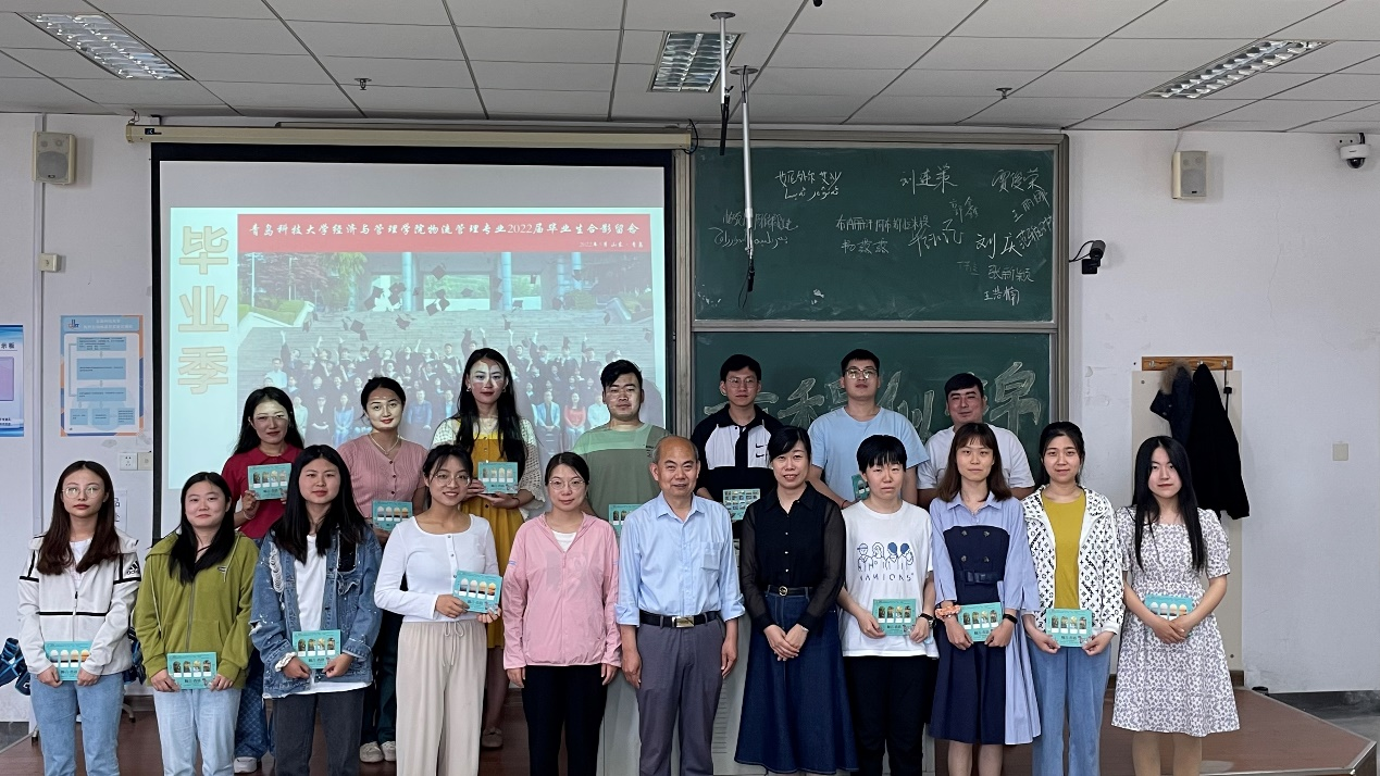 最后,师生共同拍摄了专业全家福,老师为同学们准备了毕业纪念礼物——青岛明信片,欢迎同学们常回家看看,青科大物流是同学们永远的家。伴随着座谈会的结束,物流管理系2022届毕业生的老员工涯即将结束,但崭新的人生舞台才刚刚开启,期待这些少年能够在未来乘风破浪,披荆斩棘,拥抱精彩人生。
