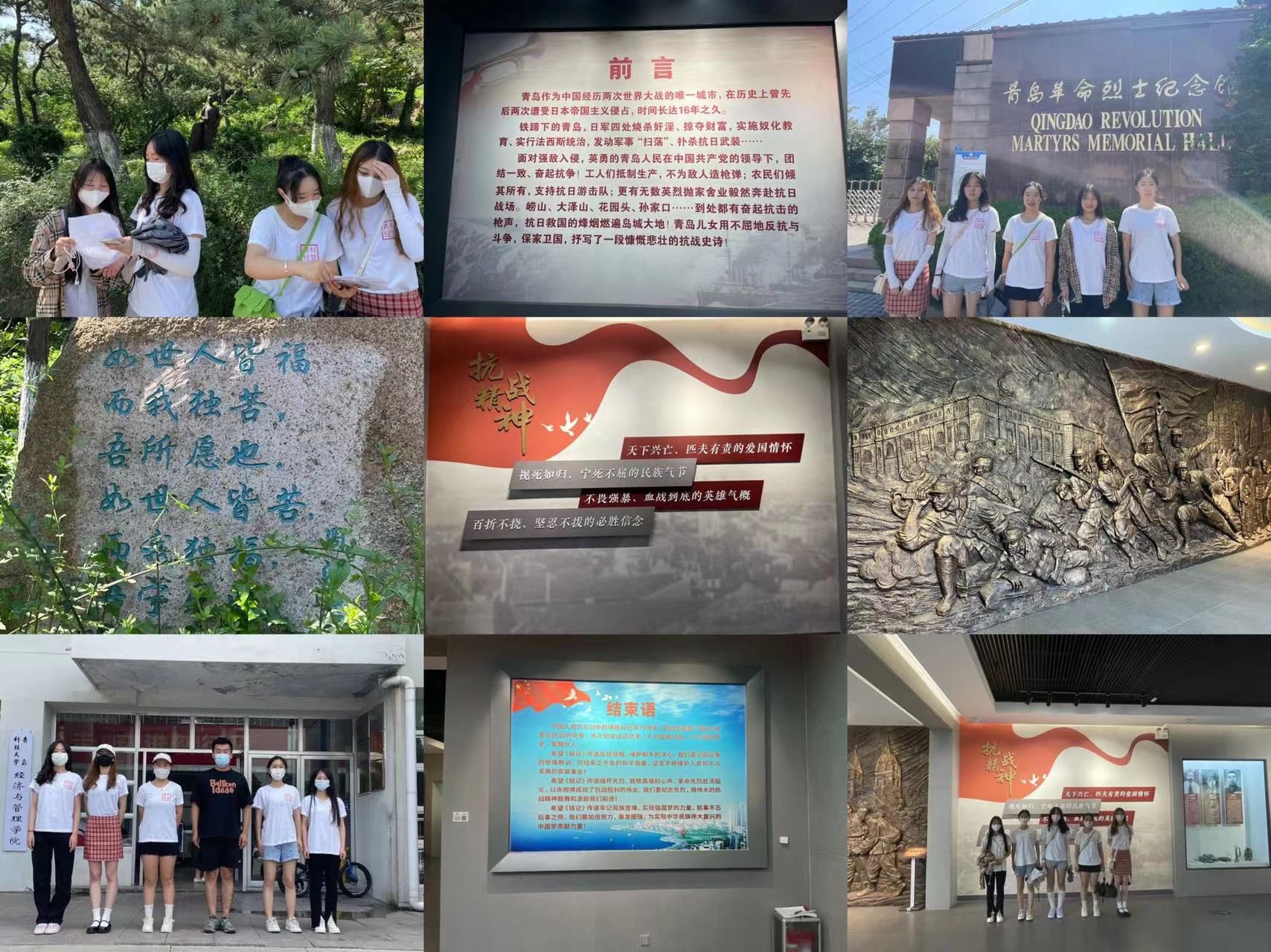 七月八日,社会实践成员前往青岛革命烈士纪念馆进行参观学习。“山河魂”烈士群雕坐落于纪念馆中坪广场正中央,烈士群雕以党的一大代表、青岛党组织创建人邓恩铭为原型,周围并肩站立着工人、员工、农民及童工代表,象征着不屈不挠的青岛人民在中国共产党领导下开展的波澜壮阔的革命斗争,同时也喻示着英烈的丰功伟绩与山河共存、与日月同辉。