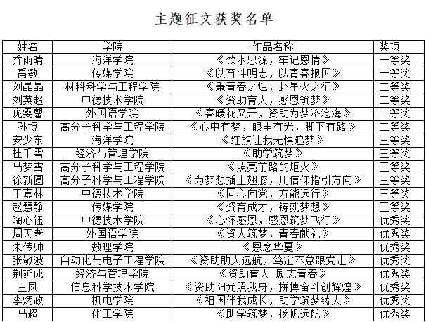 其中,物流201班员工杜千雪的文章《助学筑梦》获大赛三等奖,国贸201班员工荆延成的文章《资助育人·励志青春》获大赛优秀奖。