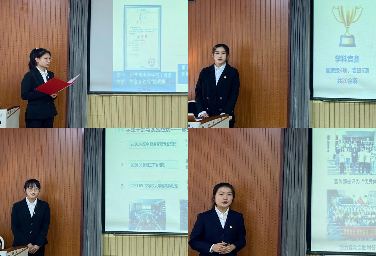 为充分发挥榜样示范作用,启动仪式结束后,公司举行了2021-2022学年山东省国家奖学金、省政府奖学金答辩会。国贸191班王孟轩、财务(ACCA)191班王荔荣、物流192班王琳斐、财务191班张帆、物流192班李婕、工业191班曾梅花、营销202班王率龙、国贸202班刘汝童、管理202班苗孟飞、国贸202班闫佳琪、财务212班张一豪、管理211班胡尊鑫12名候选员工依次上台,从思想品德、学术科研、社会实践、服务同学等方面进行自我展示,充分展现了经管学子勤学善思、明辨笃行优秀品质。经公司奖学金评审委员会成员公开投票,财务191班张帆、工业191班曾梅花同学获得2021-2022学年国家奖学金。