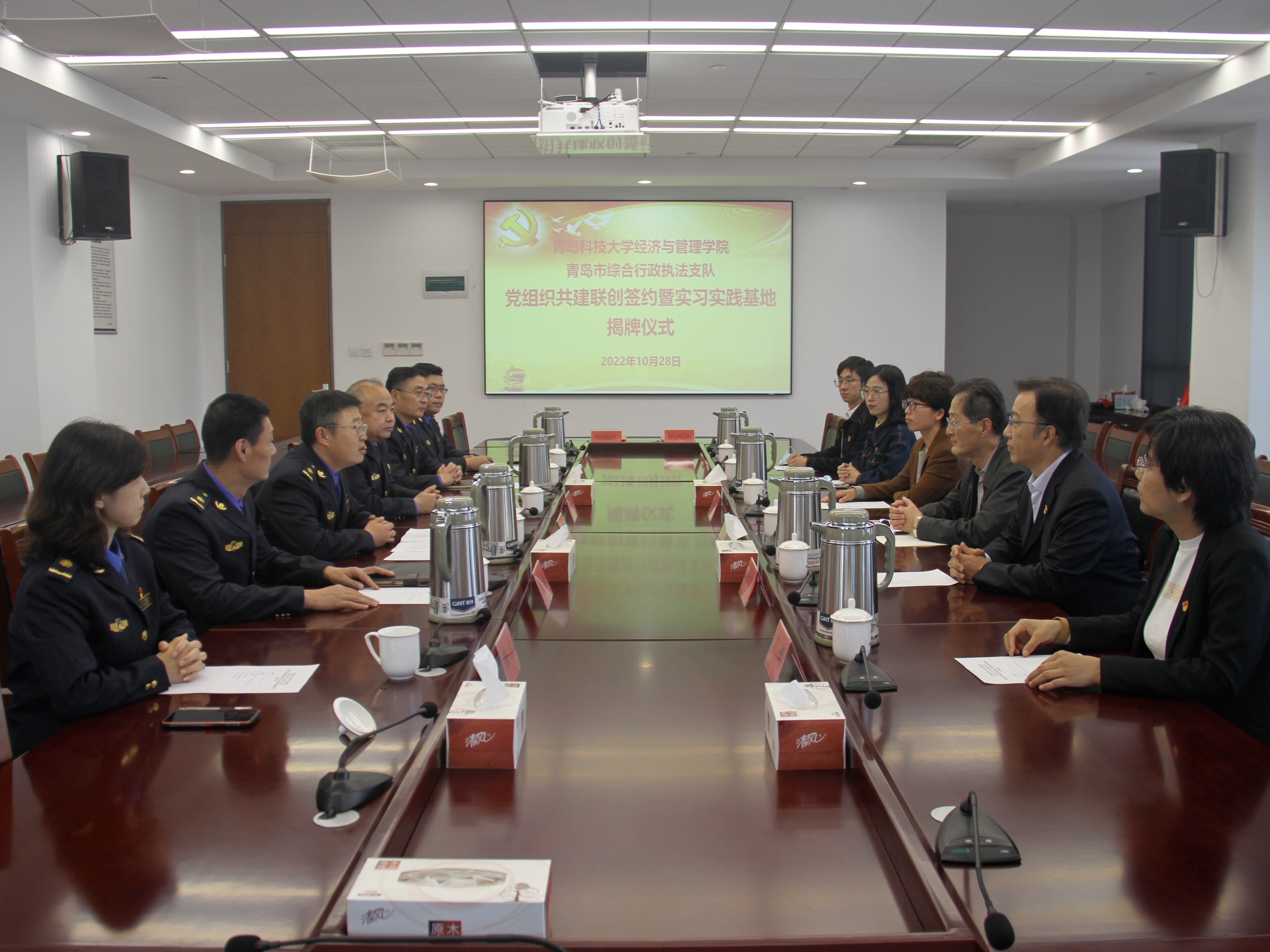 签约揭牌仪式上,双方介绍了各自基本情况及党建、业务工作开展情况,就城市管理的概念和内涵、管理与执法的关系、拆违治乱、创建全国文明典范城市工作中的执法实践等进行了深入细致的探讨和交流。在党组织共建方式及实习实践基地的岗位资源、实习模式、课题研究等方面达成了初步意向,旨在构建“结对互动、双向促进、共同提升“的政产学研融合新格局。