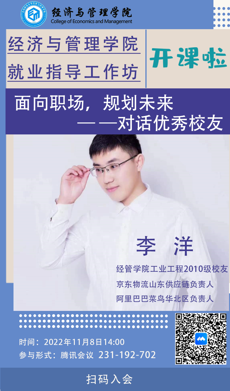 李洋从面向职场的5点准备、就业创业的5项选择和规划未来的5个问题入手,逐一给出意见建议。一是,面向职场的5点准备是:目标、时间、里程碑、执行和决策;二是,就业创业的5项判断是:考研、考公、就业,创业,选哪个;毕业是回家乡,还是去大城市打拼;就业的方向是贴合自己的专业,还是随意;选择大公司还是小公司,如何判断是一家好公司;以及毕业后如何面对恋爱中的TA。三是,规划未来的5个问题是:现在公司到底要什么样的人;老员工毕业创业该怎么做,如何判断时机;到了职场之后,需要具备哪些能力;第一份工作重不重要,面对跳槽要注意什么;以及市场的销售工作比较多,判断自己是否适合干销售。李洋结合个人成长经验娓娓道来,与同学们不时进行互动,线上会议气氛活跃,同学们收获良多。