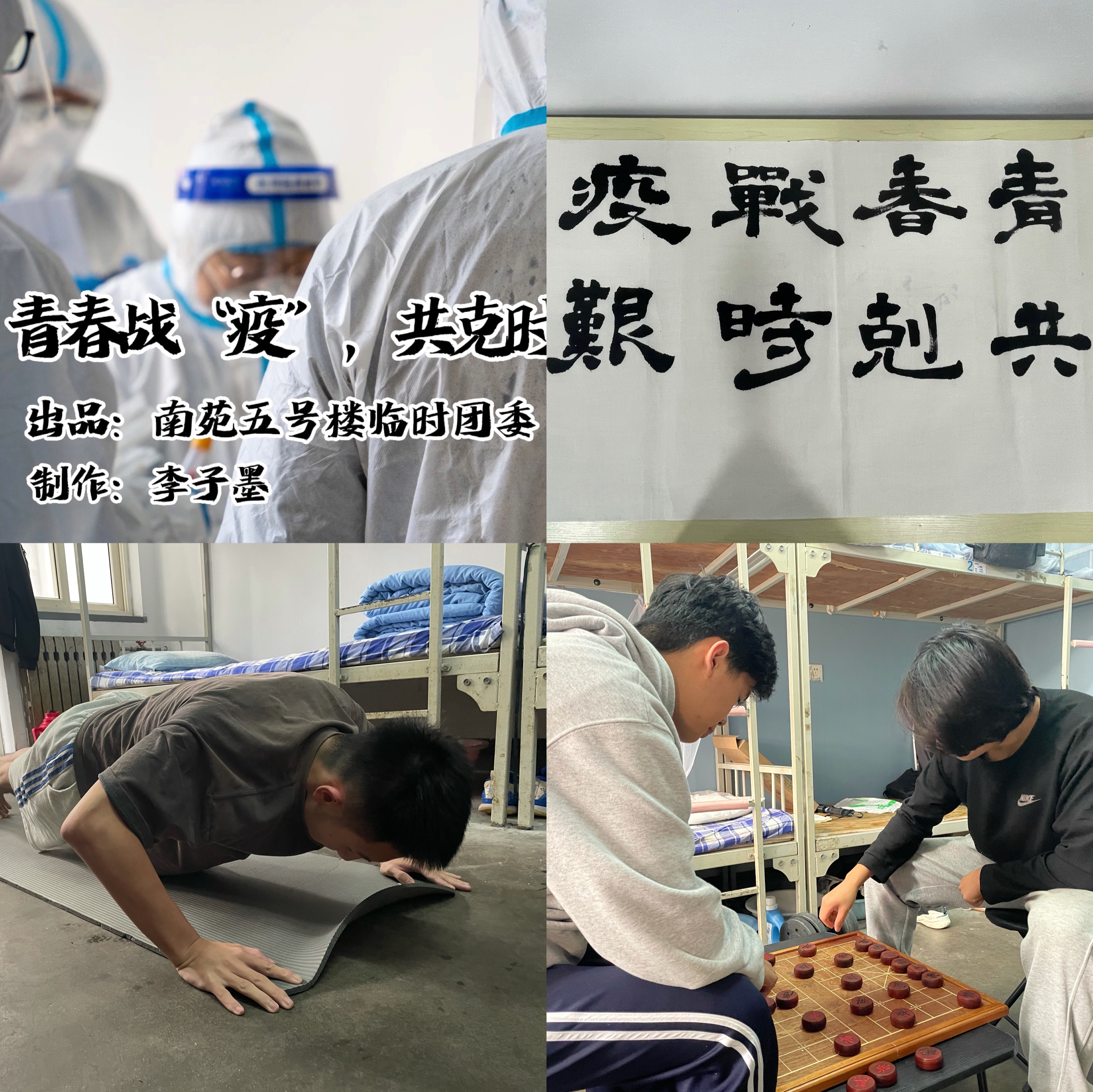 根据公司团委“抗疫有我 时刻准备 青春有为”主题系列活动方案要求,南苑5号员工宿舍楼战“疫”临时团委在静默管理期间组织开展“青春战‘疫’ 共克时艰”主题团日活动,通过思想引领、文化创作、体育运动等多种活动形式,把广团员青年“以点带面”全面动员起来,活跃学习、生活氛围,最广泛程度地凝聚起强大正能量。开展俯卧撑计数赛、静态平板支撑赛,用体育锻炼凝聚抗击疫情的“硬核力量”;开展象棋、五子棋等积极健康向上的益智类棋牌活动,舒缓静默隔离给员工带来的心理压力;通过绘画、书法等多种形式的宣传活动,将员工眼中所见、心中所思用作品展现,为参与防疫一线的志愿者们加油;制作《青春战‘疫’,共克时艰》主题MV,展现了疫情期间志愿者们在抗疫前线辛劳付出的身影和封校前后南五号楼里的温暖点滴,积极引导广大青年争做战“疫”的先行者、守卫者。