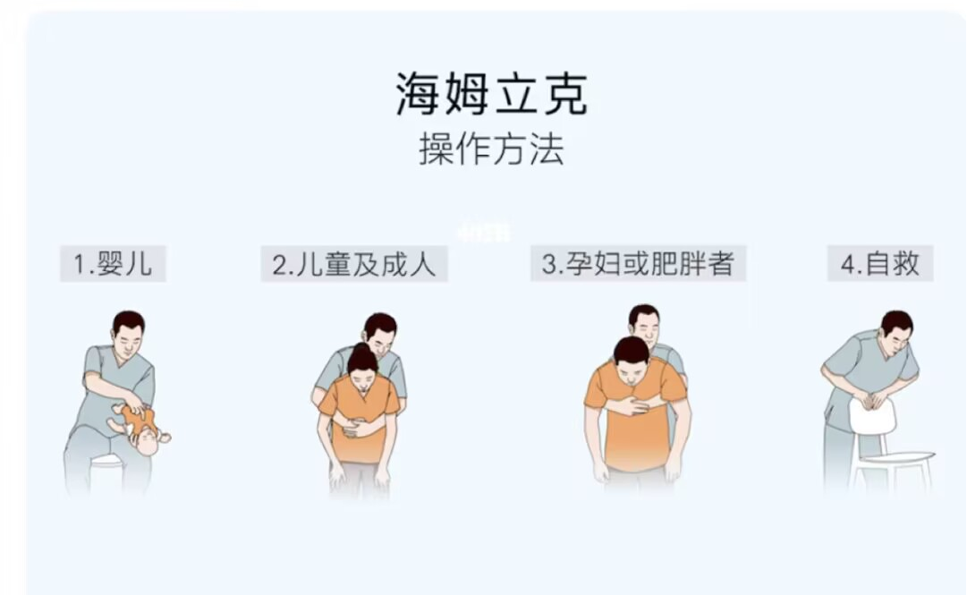 4.海姆立克急救法异物卡喉):对于3岁以上患者被救者可处于坐位或立位,施救者站于被救者后背,双手环抱被救者,以右手拇指掌指关节,即较硬骨性结构,置于腹部正中其上位置。另一手按压在右手拳头上,向上向内快速冲击6-10次,此时胸腔内压迅速上升,有利于气道中的异物排出;因此对于3岁以下儿童,第一种方法可能会造成患儿的二次损伤,如果发生气道阻塞导致窒息,可将患儿倒扣在施救者膝盖上,使患儿头部尽可能低于膝盖平面,右手迅速拍击患儿后背1-5次,此时有可能使患儿气道内的异物经口排出。