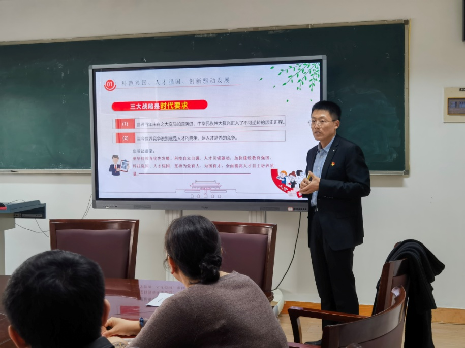 宣讲以人才为切入点,阐述三大战略的贯彻与落实需要握稳优先发展教育事业的"方向盘"、需要夯实科技创新治理体系这个"压舱石"、需要答好培育拔尖创新型人才这个"大考卷"。同时号召广大老师牢记教育初心,不忘为党育人、为国育才使命,把立德树人贯穿到工作各个环节,做好员工为学、为事、为人的大先生。