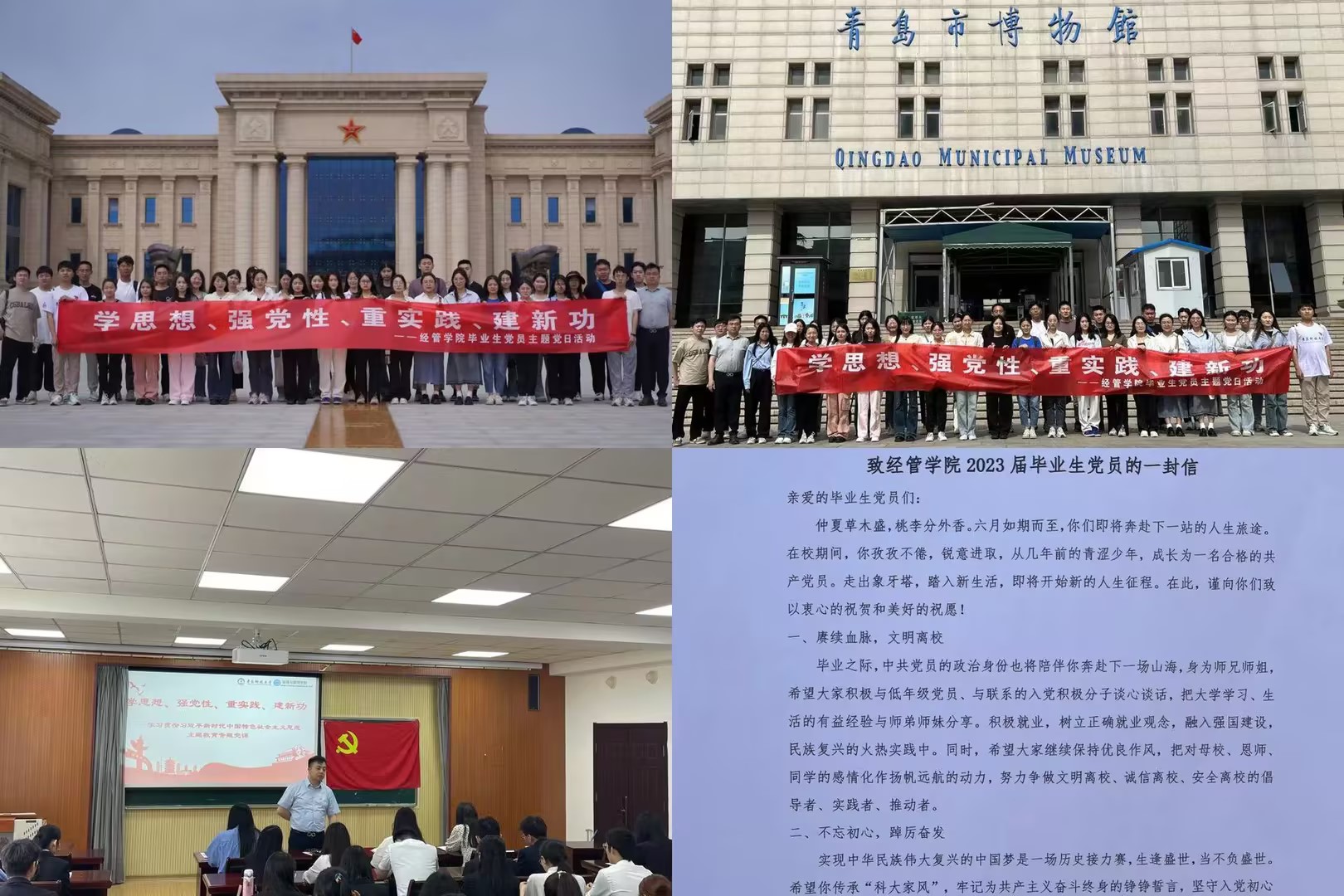 在青岛市博物馆,全体毕业生党员追寻红色踪迹,深刻感受历史赋予我辈青年的责任与使命。一幅幅老照片、一件件老物件,仿佛把大家带回到炮火和硝烟弥漫的历史中,在场每一位党员内心都波澜壮阔、感慨万千。全体毕业生党员纷纷表示,中国青年自古至今都不惧新生,甘于奉献,以解天下之忧,人民之苦。一个国家最好看的风景,就是这个国家的年轻人,作为新时代青年要从历史中汲取奋力前行的磅礴力量,以青春之力将中华文化的星火代代延续!