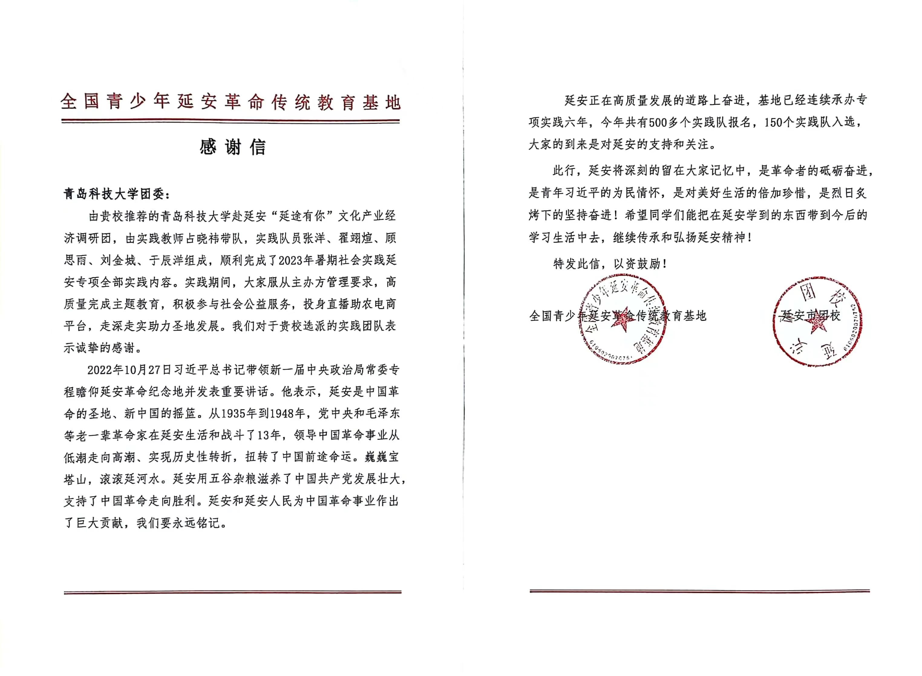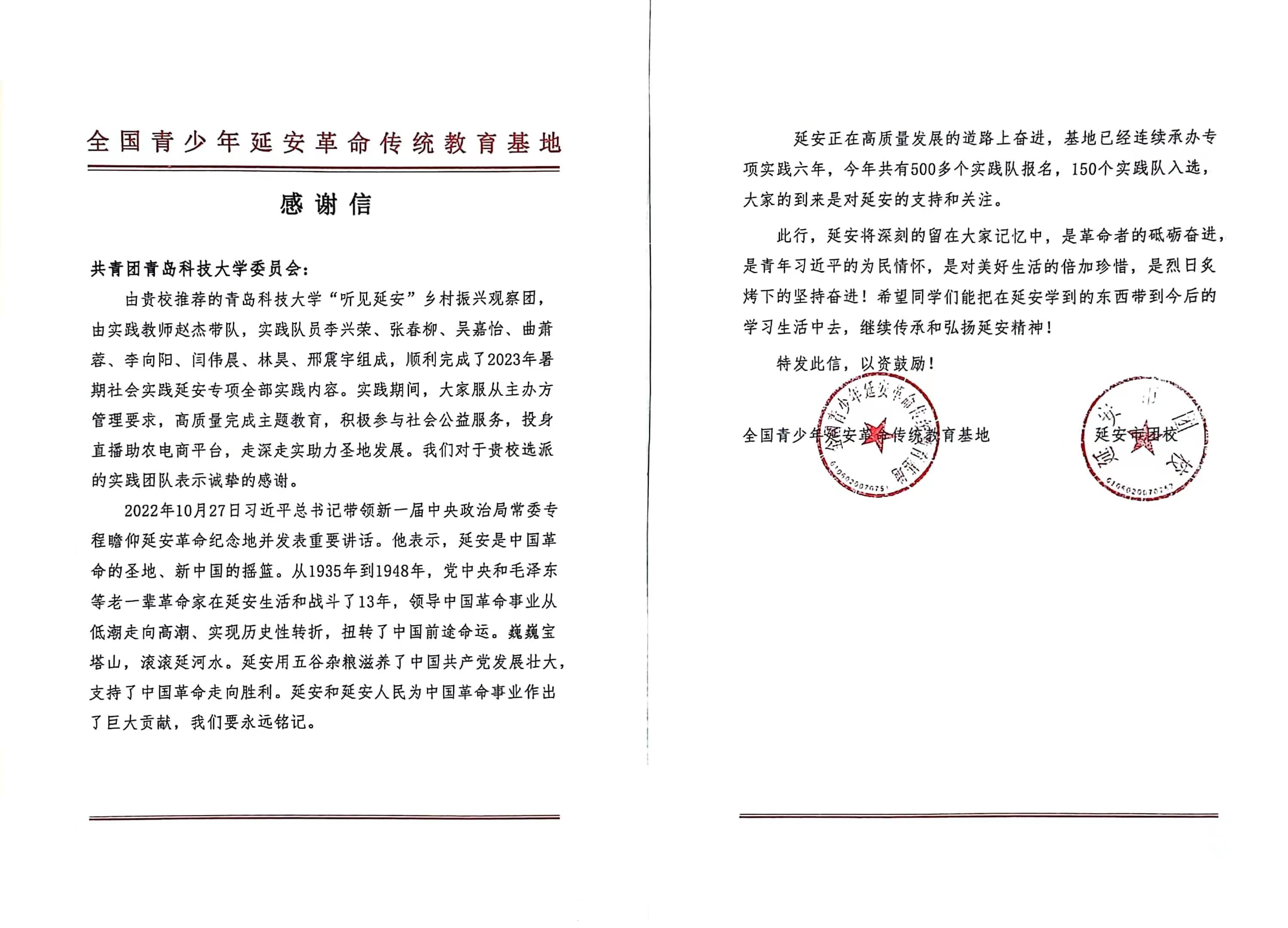此次收到全国青少年延安革命传统教育基地、延安市团校感谢信是对经管公司实践育人成果的充分肯定和高度认可。接下来,公司将继续深化实践育人内涵,引领广大青年员工在社会实践的大课堂中“自找苦吃”,以苦励志,在志愿服务的淬炼中书写崭新篇章。