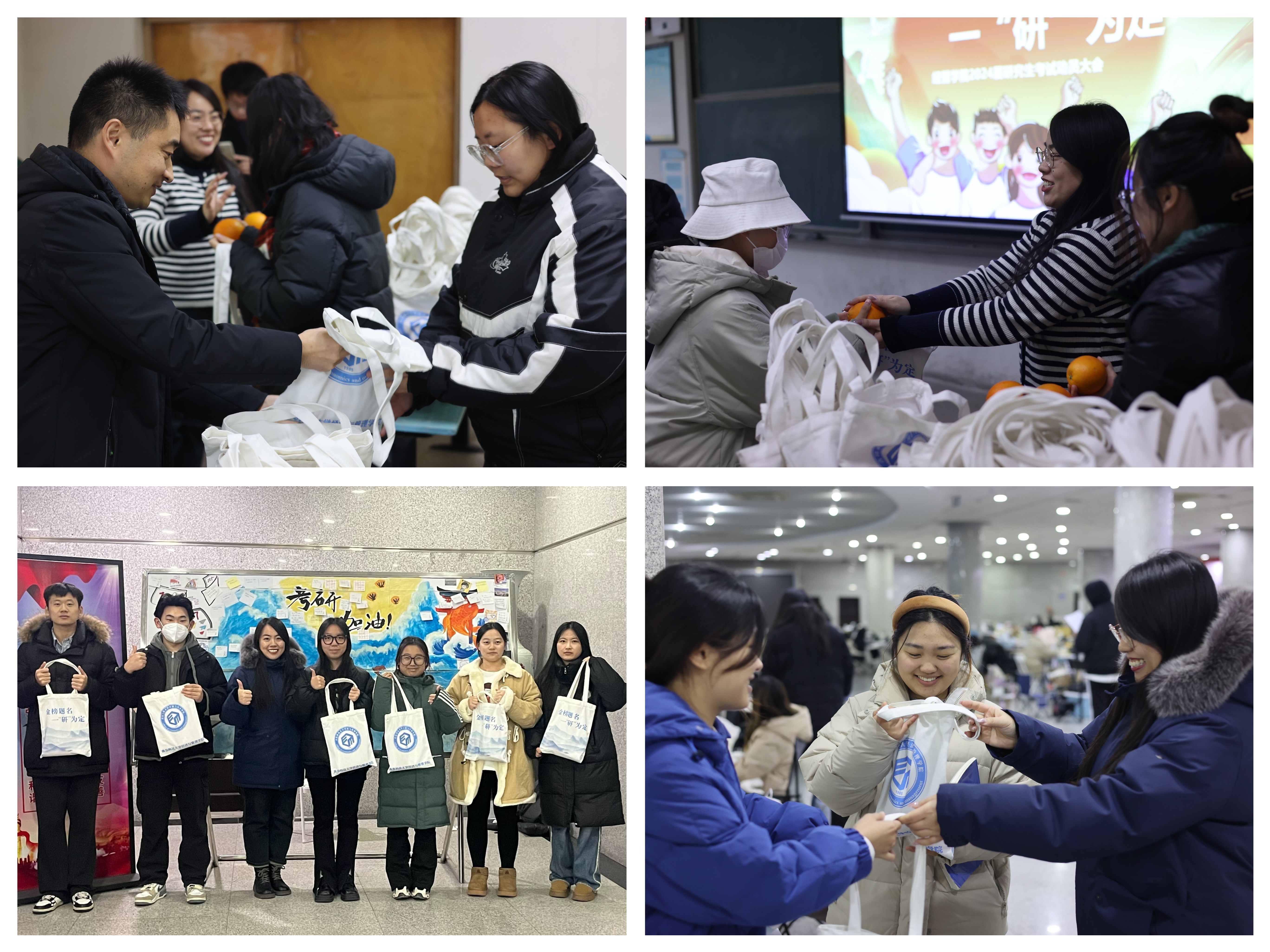 为在严寒备考的考生们温暖护航,公司为同学们发放了“金榜题名”加油礼包,考试文具、励志书签、可口可乐、新鲜橙子、定制布包、健康口罩……小小加油包满载了公司对学子的暖心祝福——“下笔有神”“读书万卷”“万事可乐”“心想事成”“保你上岸”“健康相伴”。为了能给每一位考生道一声“加油”,公司辅导员老师们走进图书馆、教学楼,把“加油包”送到了辛苦备考的同学们手里,也把公司的关怀与嘱托送进了每一个人的心里。同学们拿到加油包后,纷纷表示,在惊喜之余,更是满满的感动,感受到了公司沉甸甸的爱,倍受鼓舞,充满力量,更加坚定了考试的决心和信心。