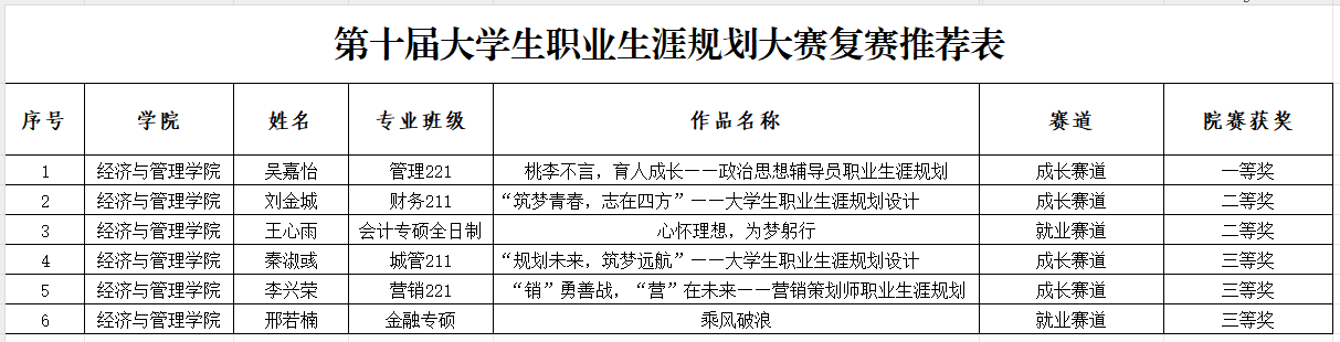 经过参赛员工激烈角逐,评审委员会研究认定,在成长赛道的评比中,管理221吴嘉怡获一等奖,财务211刘金城、会计专硕全日制王心雨获二等奖,城管211秦淑彧、营销221李兴荣、金融专硕邢若楠获三等奖。获奖作品将直接推荐至校赛。