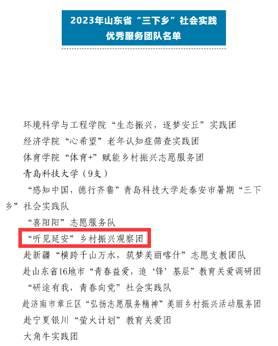 近日,2023年“调研山东”——暑期“三下乡”社会实践活动评优结果公布,经管学子奋楫扬帆,赓续前行,获多项荣誉。营销221班李兴荣获评“优秀员工”,“听见延安”乡村振兴观察团获评“优秀服务团队”。