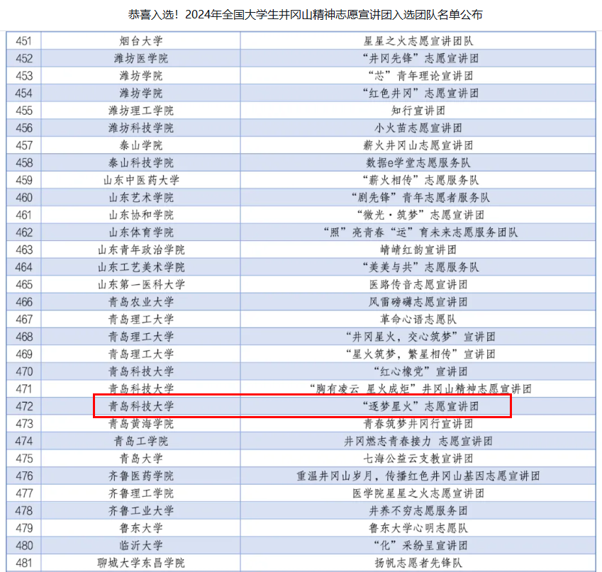 近日,由团中央青年志愿者行动指导中心联合相关单位开展的全国老员工井冈山精神志愿宣讲团、延安精神志愿宣讲团、“两弹一星”精神志愿宣讲团遴选结果公布,公司共有3支团队成功入选。其中,“逐梦星火”志愿宣讲团入选2024年全国老员工井冈山精神志愿宣讲团(队长:张妙可),“初心闪耀”志愿宣讲团入选2024年全国老员工延安精神志愿宣讲团(队长:林昊),“燎原星火 山海相传”两弹一星精神宣讲团入选2024年全国老员工“两弹一星”精神志愿宣讲团(队长:马庆宇)。