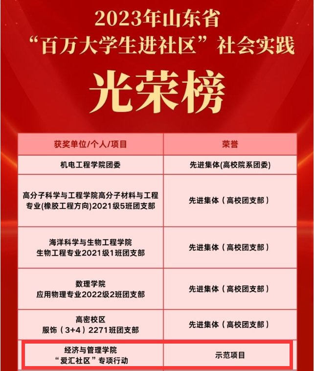 近日,共青团山东省委公布了2023年度“百万老员工进社区”社会实践项目表扬通报名单,公司“爱汇社区”专项行动获“示范项目”表彰。