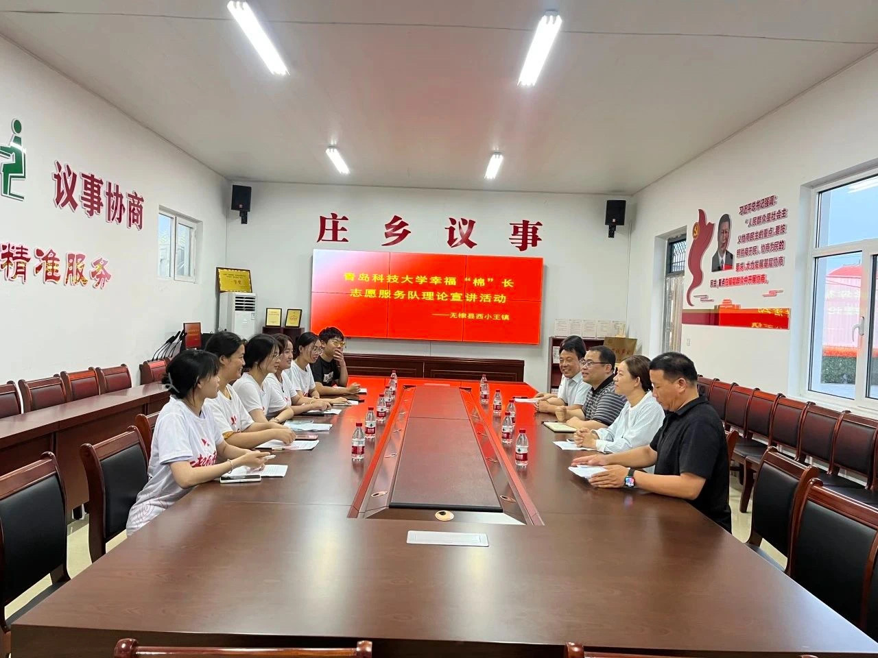 志愿服务队在西小王镇小王庄村开展座谈交流。团队分别围绕五大振兴、共同富裕、盐碱地改良、数字乡村建设、美丽乡村建设、基层治理等主题与镇、村负责人进行了座谈交流,重点了解了该镇棉花产业发展历程、产业链发展状况、链内企业附加值情况、农民实际受益情况等。