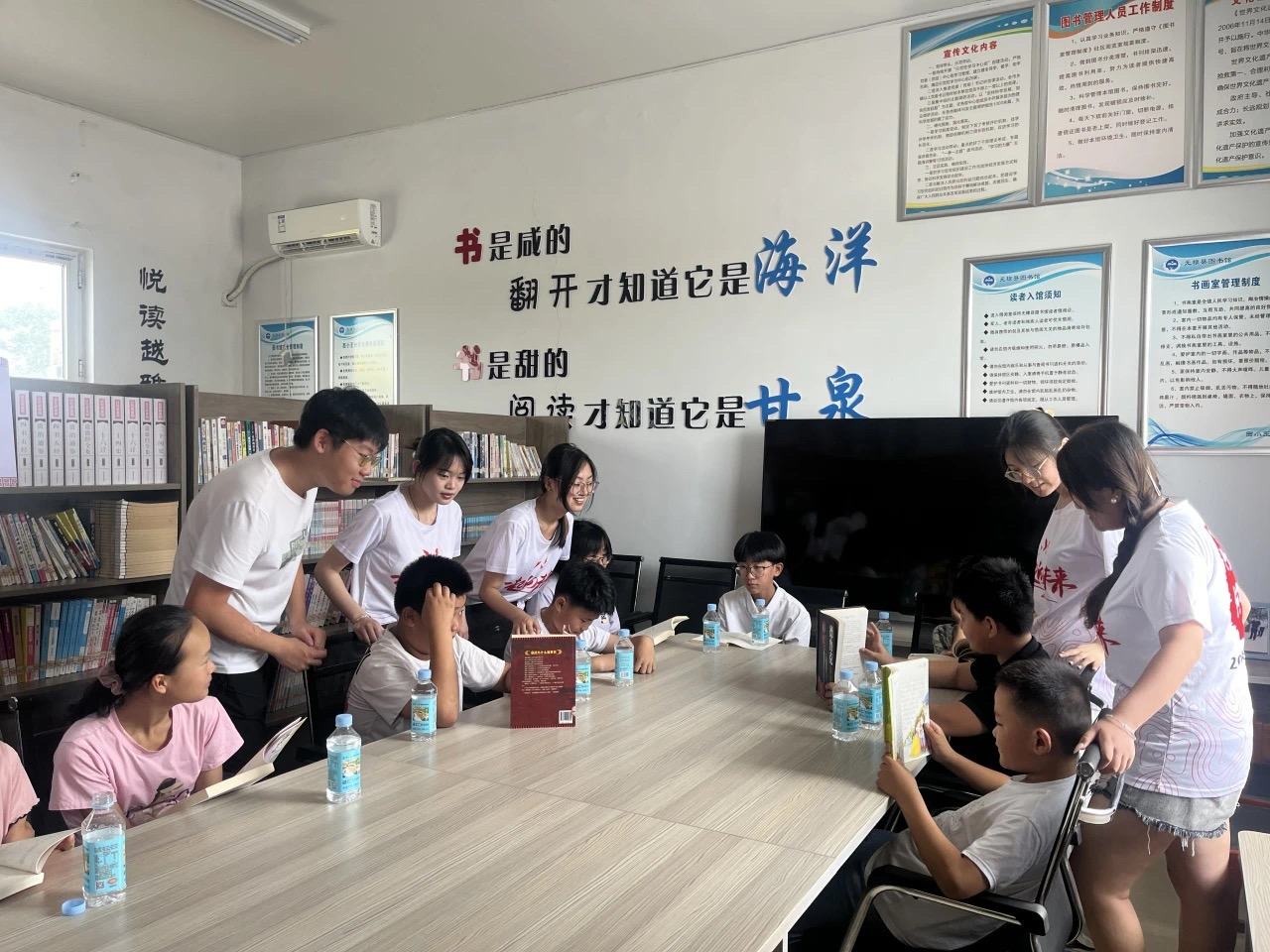 志愿服务队到小王庄村图书室与暑期托管班孩子开展阅读分享活动。