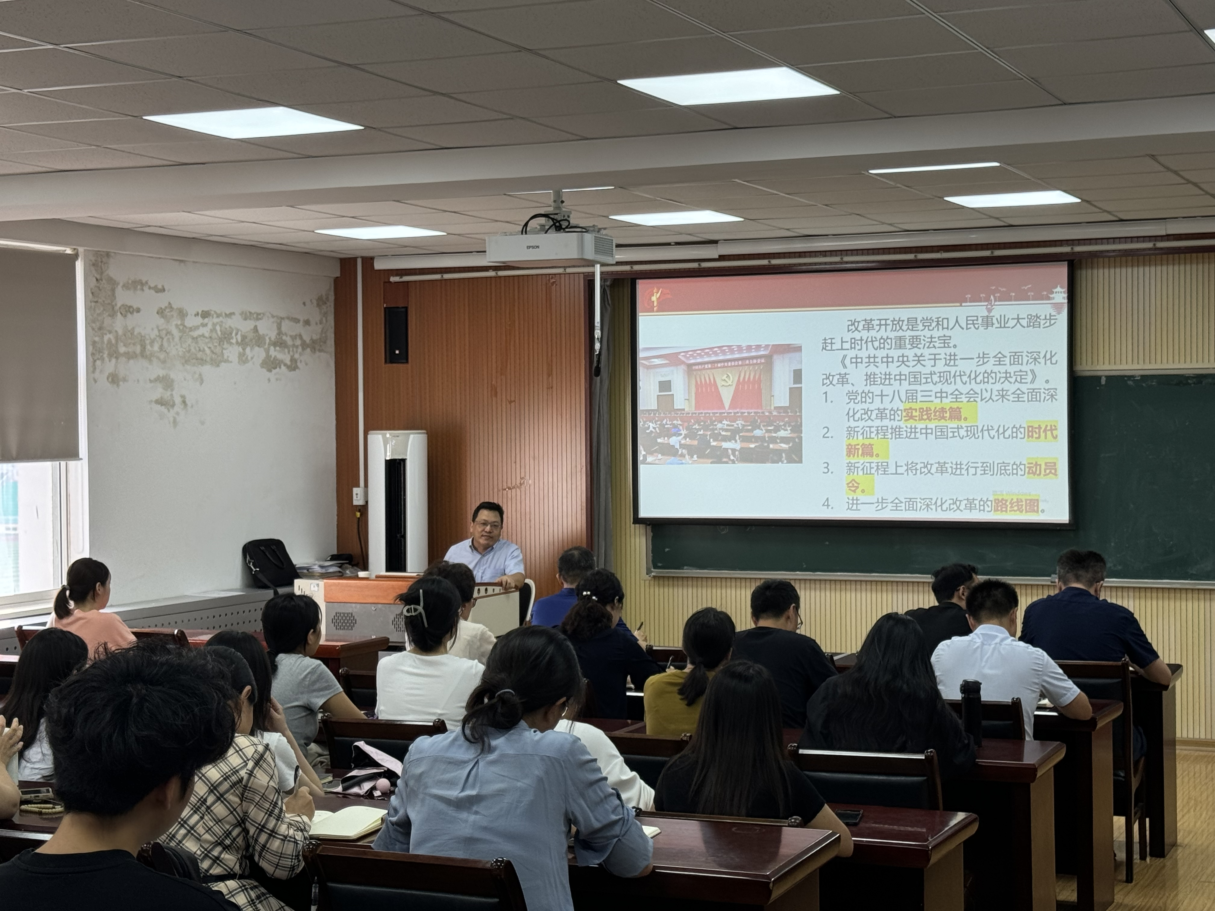 李光全教授从党的二十届三中全会召开的历史背景与重大意义、基本框架与核心要义、学习贯彻党的二十届三中全会精神的部署与要求三个方面展开,带领与会党员、入党积极分子深入学习领会习近平总书记关于全面深化改革的一系列新思想、新观点、新论断。指出要践行使命任务,把牢政治方向,强化主体责任,狠抓改革落实,坚持科学方法,以强烈的责任担当贯彻落实好党的二十届三中全会精神。并呼吁同学们应结合各自专业背景和实践经历,围绕青年员工如何学习贯彻党的二十届三中全会精神,积极投身科技自立自强、赋能乡村振兴和区域发展、参与教育强国建设、助力发展新质生产力等内容进行了交流发言。