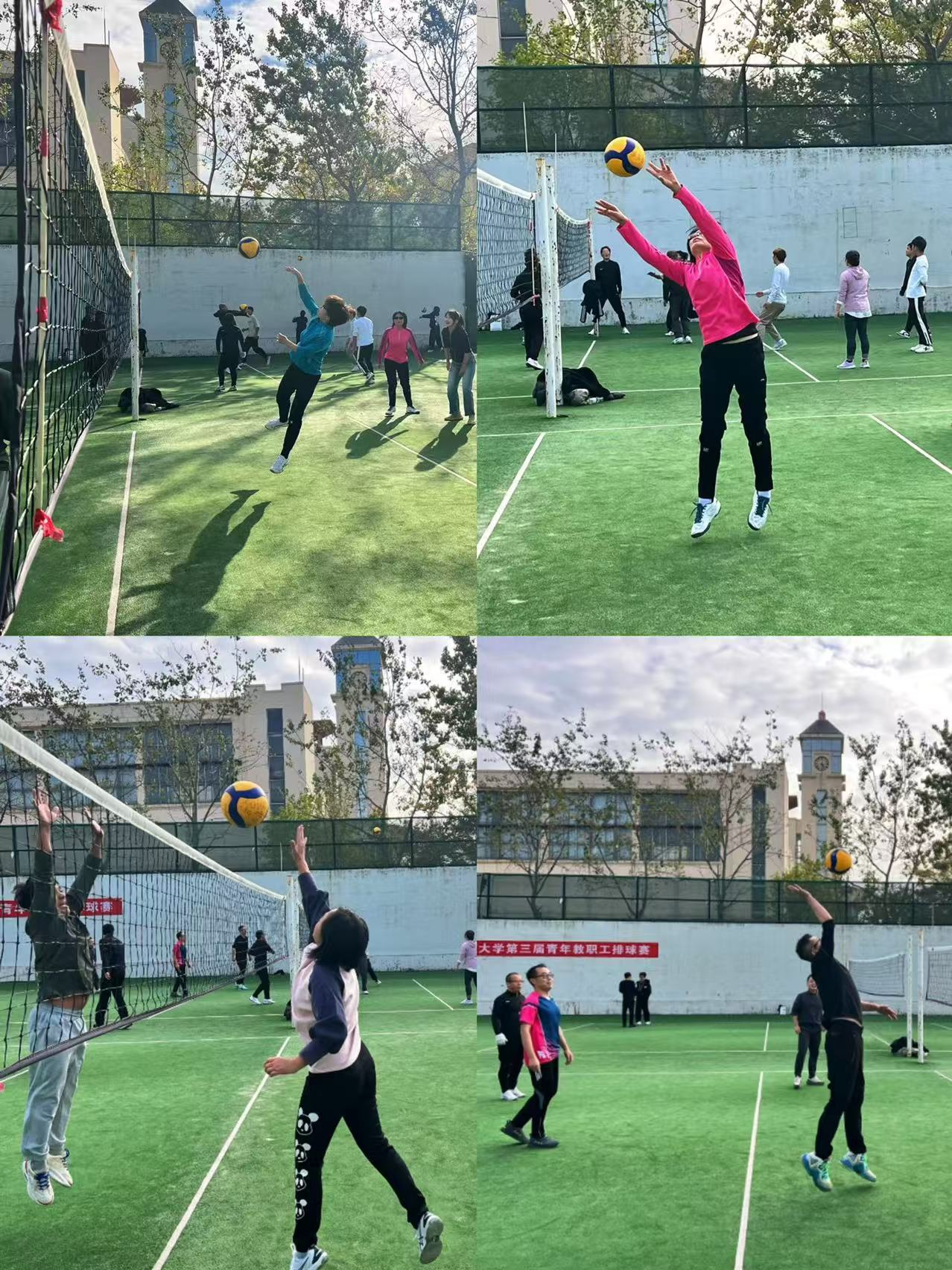 比赛在紧张而友好的氛围中进行。赛场上,李老师与老师们身姿矫健,配合默契,展现出了高超的球技和团队协作精神。他们的每一次扣杀、拦网和救球都赢得了在场观众的阵阵掌声和欢呼声。赛场上,各参赛队伍热情高涨,斗志昂扬,展现了积极向上的精神风貌。比赛分为女子青年队,女子中年队,男子队,员工队,男女混合队等多个小组,既有男女排老师之间的对决,也有师生混合队伍的趣味比拼,使得整个赛场气氛热烈而和谐。比赛中双方队员相互鼓励,彼此尊重,充分体现了友谊第一、比赛第二的体育精神。