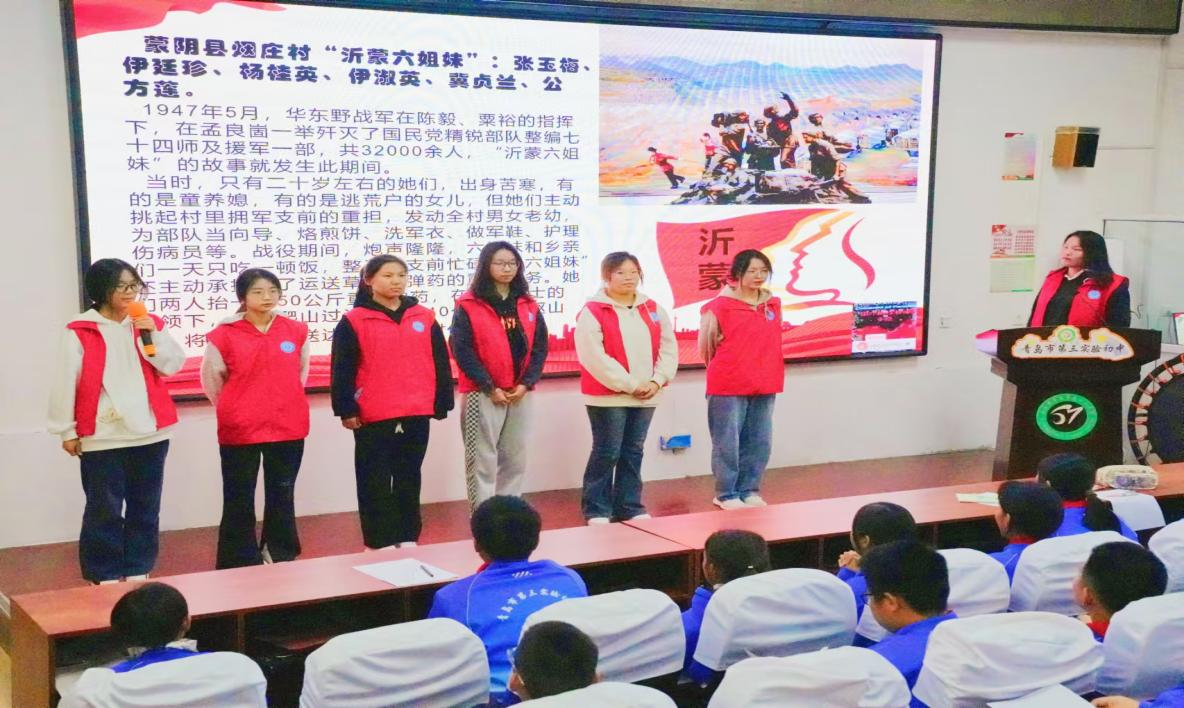 在进行红色精神宣讲活动过程中,同学们积极配合,通过声情并茂的朗读品味抗战时期人民团结一致的精神品质,志愿者代表则以抗战历史为背景,带领大家重温抗战时期血雨腥风的悲壮历史,通过“沂蒙六姐妹”和沂蒙母亲——王换于的故事,带领同学们感受抗战时期的人情美和人性美。