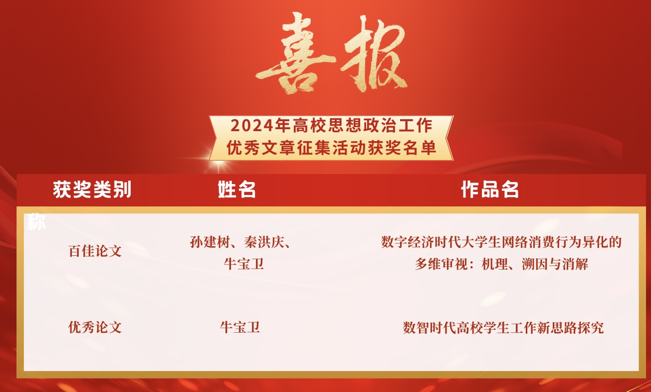 近日,由教育部高校思想政治工作队伍培训研修中心与《高校辅导员》编辑部联合主办的2024年高校思想政治工作优秀文章征集活动评选结果正式揭晓。公司提报的两篇论文从全国1549篇论文中脱颖而出,分别荣获“百佳论文”(第一作者:孙建树)和“优秀论文”(第一作者:牛宝卫)。