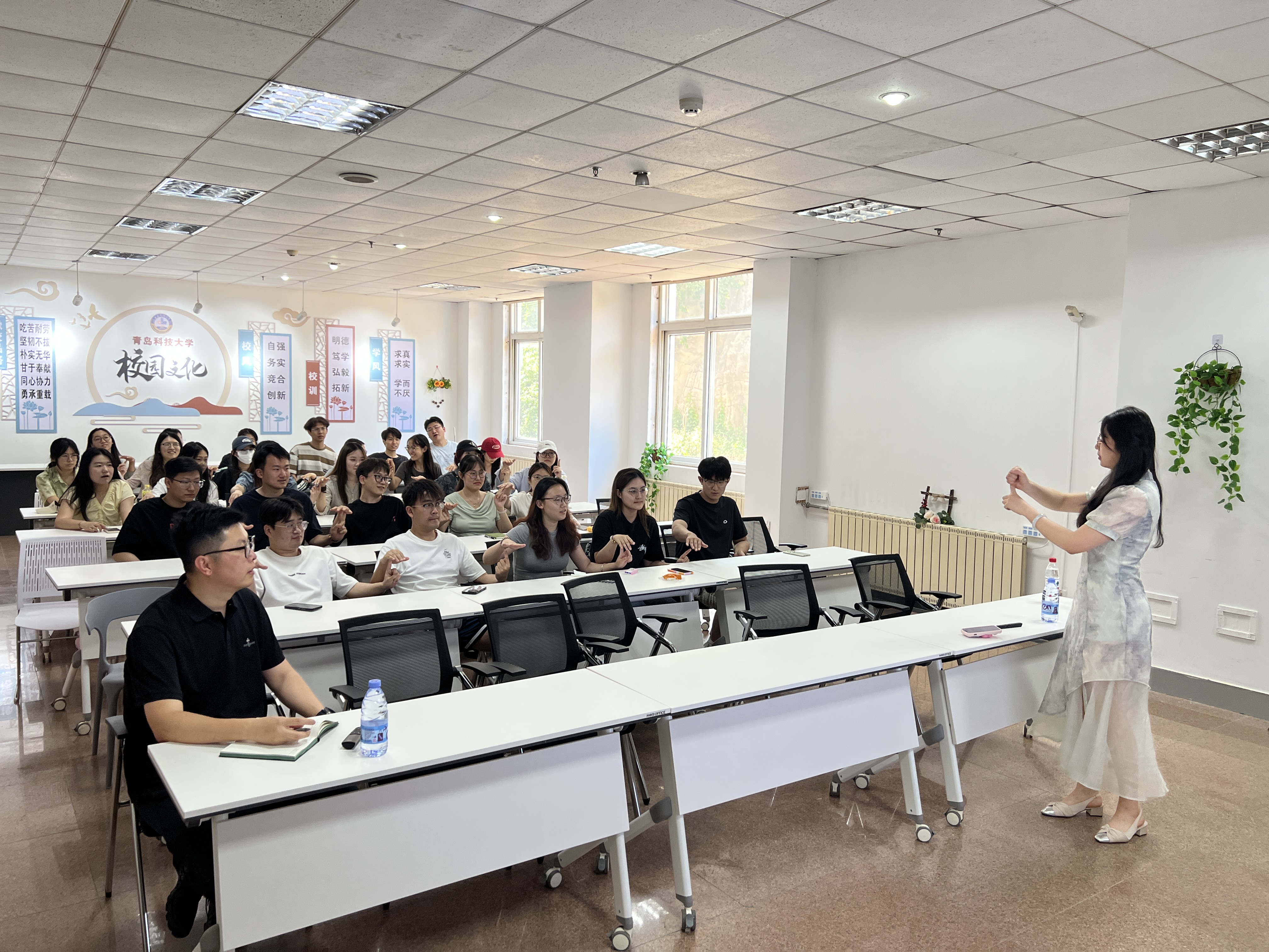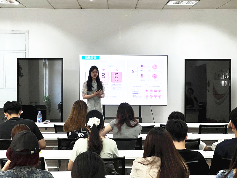 张岍以互动游戏“抓手指”及“10-90岁主要压力”的视频作为开场快速实现破冰,缓解了同学们的紧张情绪,促进了彼此间的交流;视频内容生动引入,引发同学们的思考,也激发了对于压力知识进行了解学习的兴趣。随后,张岍从压力的概念、产生原因及应对方面展开讲解,主要讲述了应对的方法,从情绪管理、认知管理、时间管理、目标管理及生活方式管理方面给出了全面可行的压力缓解方法,并强调适度的压力可以激发人的潜力,过度的压力则会适得其反,引导员工灵活运用上述各个层面的方法将压力控制在合适的范围内并利用其提升自身效率。
