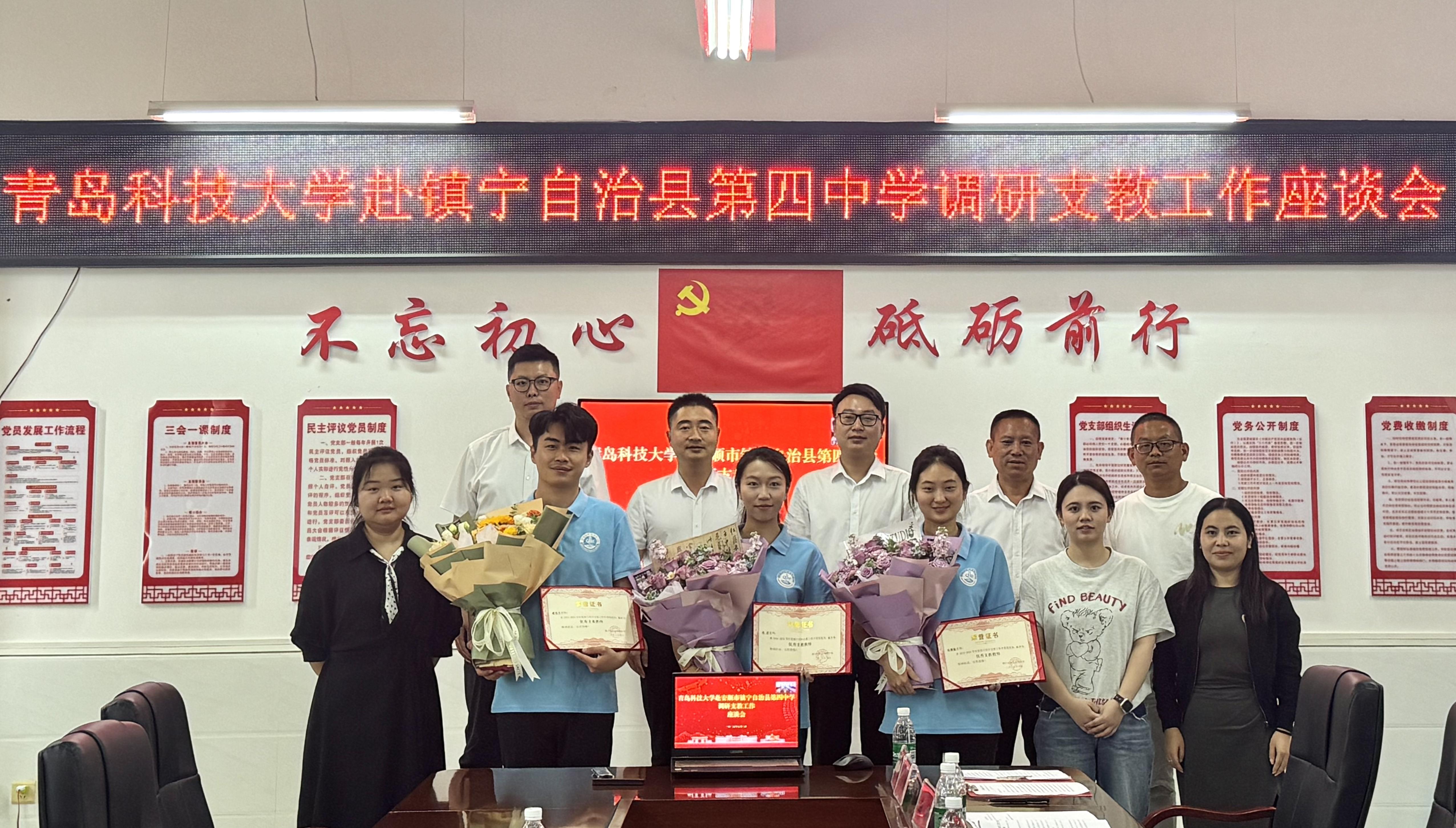 座谈会上,牛宝卫不仅激励研支团成员再接再厉、接续奋斗,发扬“科大精神”,践行“橡胶品格”,打造可持续、展特色、有成效的教育帮扶项目,为祖国西部教育事业的发展注入更多科大青年活力,同时感谢镇宁自治县团委、公司对支教团成员的关怀,肯定了支教团队在教学经验、生活技能等方面的收获,祝福成员圆满完成任务。共青团镇宁自治县委书记王一群向研支团成员一年来扎根镇宁大地、投身教育一线所取得的成绩表示肯定,并勉励成员为镇宁教育事业的发展和进步继续贡献研究生支教团的力量。镇宁自治县第四中学董事长沈广书对研支团成员工作表现做出高度评价,为三名志愿者献花并颁发荣誉证书。