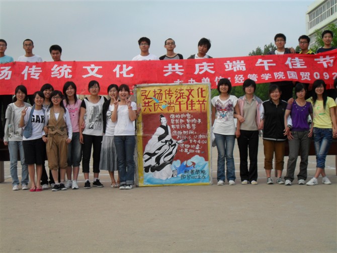 农历五月初五是我国的传统节日——端午节。值此佳节到来之际,国际经济与贸易系于2010年6月12日下午在四方校区五四广场举办了以“保护文化遗产,守卫精神家园”为主题的传统文化节,旨在弘扬传统文化,提高老员工传统文化修养。