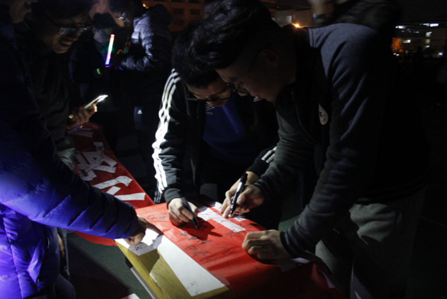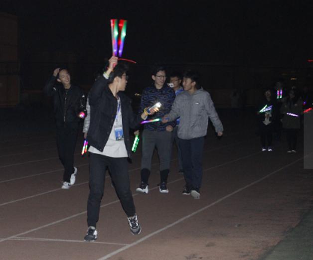 青岛冬日的寒风丝毫没有减弱同学们的热情,晚上七点整,员工们便已在操场集结完毕,主席台前荧光点点,闪烁不断。在领跑人员的带领下,队列绵延百米,形成一条闪光的长龙,追逐奔腾在南苑操场上。同学们结伴而行,紧紧相随,手中舞动的荧光棒照亮了冬日的夜空。当代老员工的团结与热情,友爱与拼搏展现于操场之上。活动结束后,同学们在横幅上纷纷签字,并在主席台前合影留念。