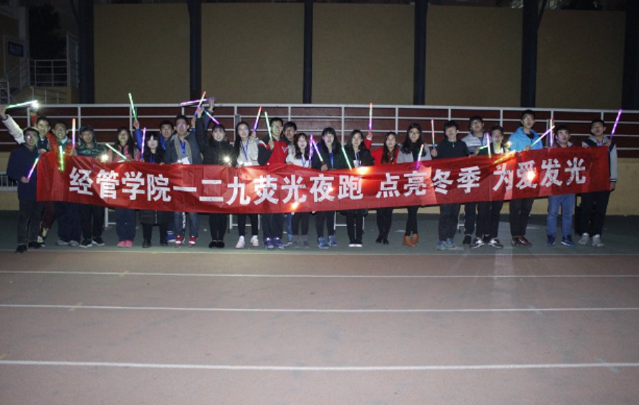 12月9日晚,为纪念“一二·九”运动81周年,熊猫体育在南苑操场举行荧光夜跑活动。此次活动吸引了三百余名经管学子参加,现场反响热烈,同学们情绪高涨。