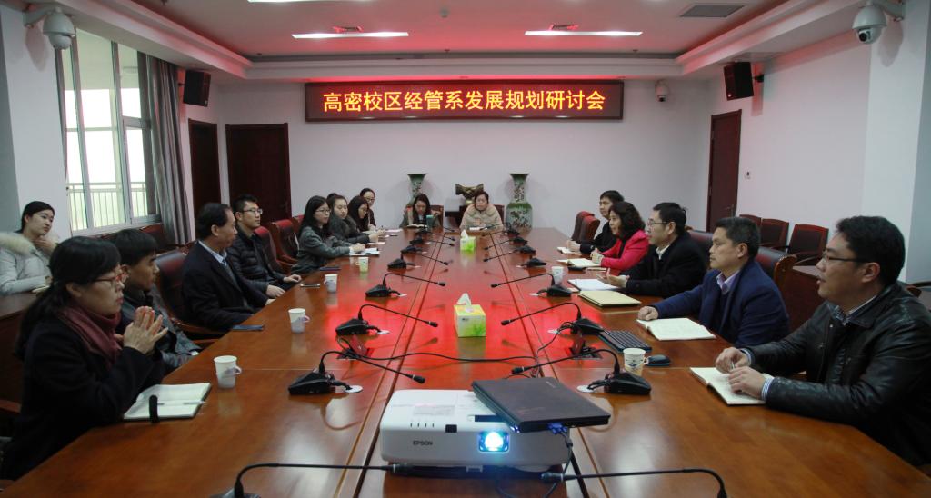 考察结束后,高密校区管理办公室负责人梁树清、官杰与熊猫体育负责人在校区图书馆楼会议室进行了座谈交流。梁树清从高密校区发展历程、发展现状和发展愿景三大方面详细介绍了高密校区的建设发展情况。姜铭汇报了经管系的发展现状及未来工作思路。与会人员就应用型人才培养、就业指导工作推进、青年教师教学培训、高密发展研究院的发展等问题进行了交流。