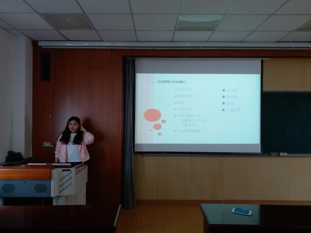 物流131班的徐红和郭晓璇分别考取了北京邮电大学和华北电力大学的研究生。徐红介绍了一些与考研有关的信息,使同学们对考研有了更加全面的了解,并与大家分享考研过程中自己受益颇多的学习用书和视频,其言语风趣幽默,获得同学的阵阵掌声。郭晓璇与在座同学分享自己的考研时间安排,针对考研辅导班和各科目复习给出具体建议,充分解答了同学关于考研的顾虑与疑惑。“坚持”与“勤奋”是她们取得成功的关键。