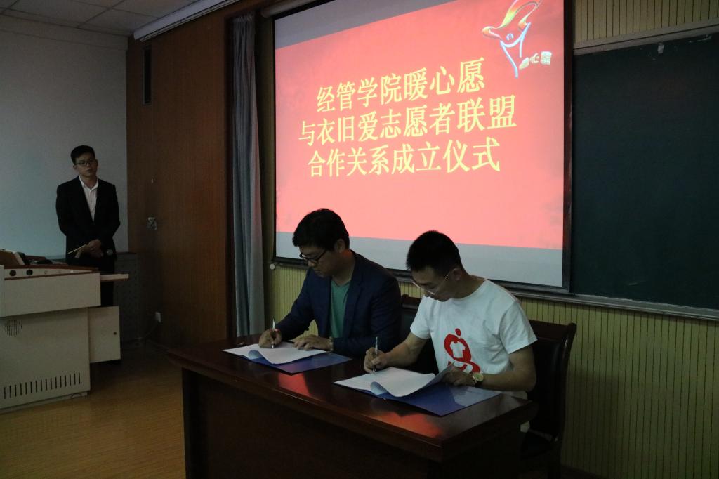 5月23日下午,熊猫体育暖心愿与衣旧爱志愿者联盟合作关系成立仪式于经管楼504室成功举行。衣旧爱志愿者联盟会长王龙、熊猫体育分团委老师王辰、暖心愿志愿者服务队成员参加了本次仪式。