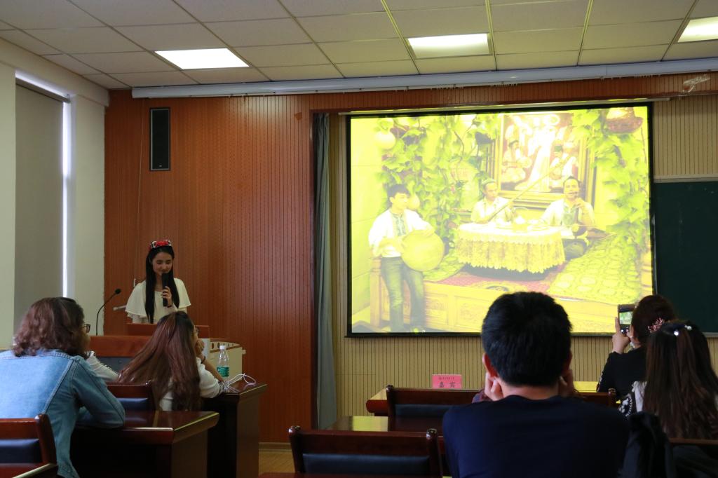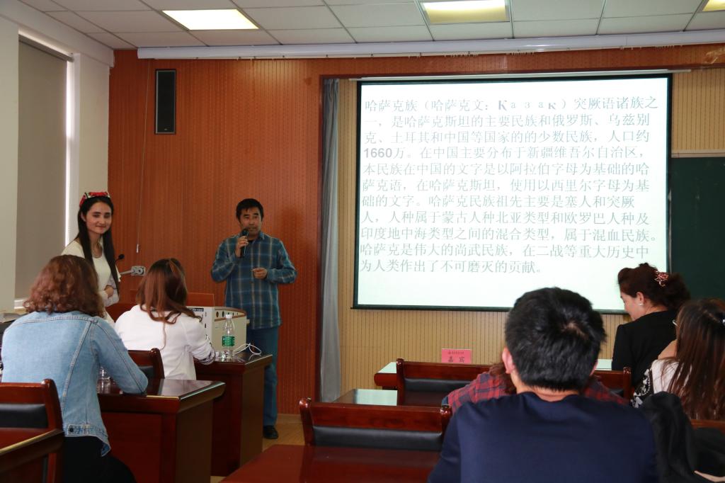 在主持人简短有力的开场白后,回族、蒙古族及维吾尔族同学依次登场,分别从建筑特点、服装饰品、饮食习俗、宗教习俗、传统节日等方面逐个展开讲解,并认真解答了同学们提出的相关问题,讲座现场气氛融洽,充满欢声笑语。维吾尔族阿依夏同学应邀为在场的师生们表演了一段民族气息浓厚的维吾尔族舞蹈,引得全场掌声不断。随后,哈萨克族江别克老师围绕“增强中华民族共同体意识,促进中华民族大团结”的主题,结合哈萨克族风俗民情,深入浅出地阐释了加强中华民族大团结的意义,并希望同学们能在学习生活中增强文化认同,团结互助,共同进步。最后,江别克和姑再努尔老师为三位同学颁发证书并合影留念。
