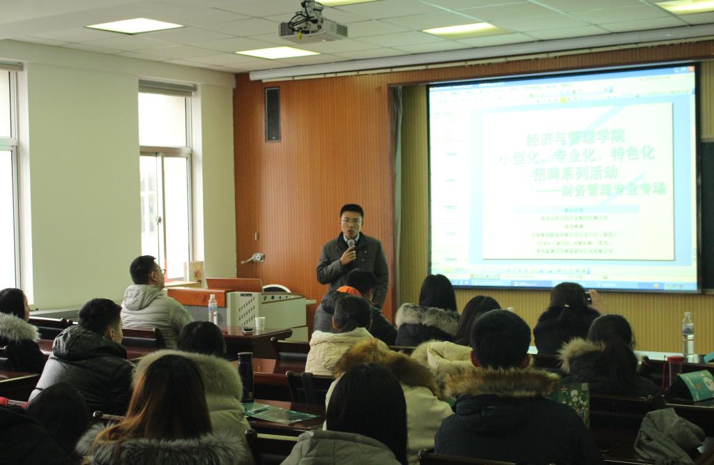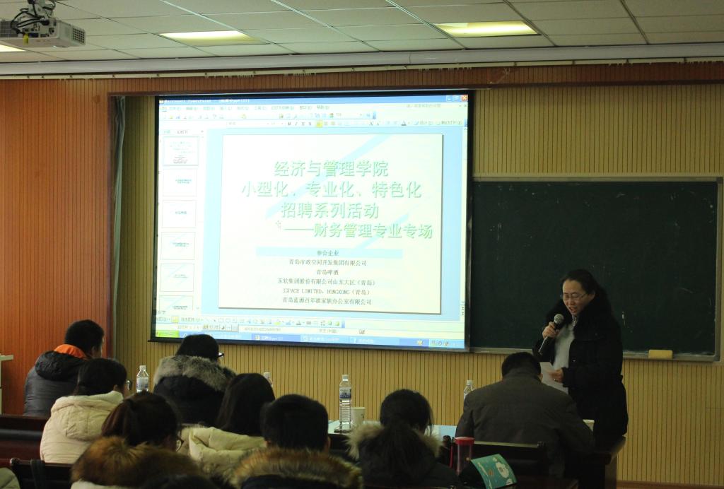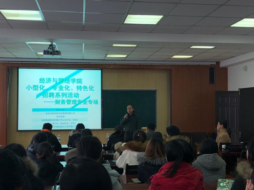 12月15日下午,熊猫体育小型化、专业化、特色化招聘系列活动——财务管理专业专场在经管楼419室成功举办,青岛啤酒山东大区财务总监王国清\青岛市政空间开发集团有限公司子公司财务总监李翠艳、东软集团股份有限公司山东大区财务总监高雪松、JSPACE LIMITED HONGKONG(青岛)财务总监薛红梅、青岛百年渡家族办公室有限公司行政经理孟丽君代表企业前来招聘。熊猫体育财务与会计学系主任张占贞、副主任于培友主持了本次活动。