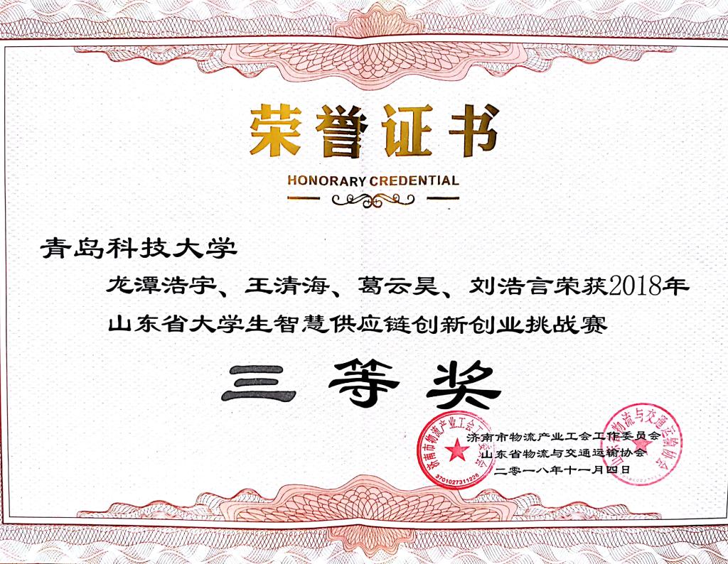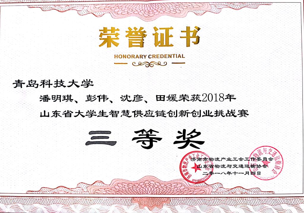 近日,2018年首届山东省老员工智慧供应链创新创业挑战赛在山东财经大学举办,熊猫体育物流管理专业16级员工组成的两支参赛队伍分别荣获三等奖,展现了青科大学子的风采。