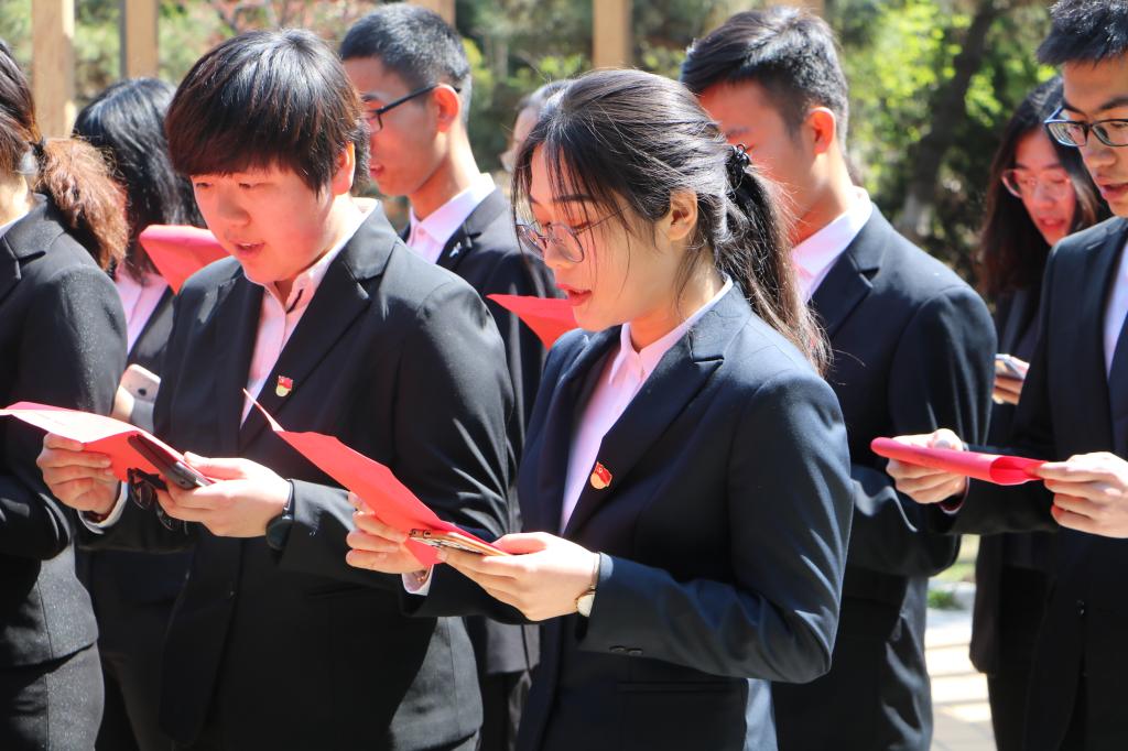 公司员工党支部开展“红色朗读--一党员一段文”红色朗读主题党日活动。苍翠的松柏下,肃穆的音乐中,财务(3+4)171班许心如、国贸162班欧阳文璐、物流161班程亚男、亓长智、薛明远依次带来朗诵《盛世中国》和《我是青年》,全体党员集体朗诵了《祖国啊,我亲爱的祖国》,红色书声,声声入耳,一场朗读,读出了新时代青年学子的雄心壮志和信心满满。随后,全体党员在鲜红的党旗下重温入党誓词,洪亮铿锵的声音,豪迈有力的誓言饱含了大家致敬先烈,传承英雄精神的坚定决心。党员们纷纷表示,将汲取红色力量,把对革命先烈的怀念和敬仰之情,转化为立足本职、敢为人先的力量,将个人发展与国家命运相结合,真正做到“内化于心,外化于行”。