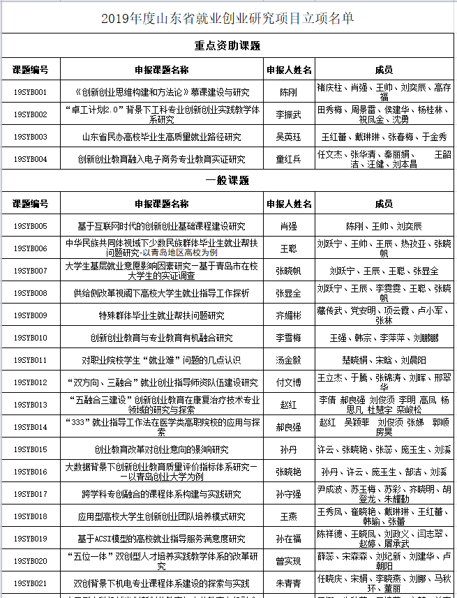 为全面贯彻习近平新时代中国特色社会主义思想和党的十九大精神,全面贯彻全国教育大会精神,突出加强就业创业理论研究的前瞻性、应用性和实践性,进一步提升就业创业工作水平,山东省社会科学基金委员会于2019年2月组织启动2019年山东省就业创业研究项目申报工作。近日,经专家评审,最终确定山东省就业创业研究项目立项40项,重点资助课题4项。熊猫体育报送的项目中华民族共同体视域下少数民族群体毕业生就业帮扶问题研究-以青岛地区高校为例、老员工基层就业意愿影响因素研究—基于青岛市在校老员工的实证调查、供给侧改革视阈下高校老员工就业指导工作探析获批立项,取得3个立项的好成绩。
