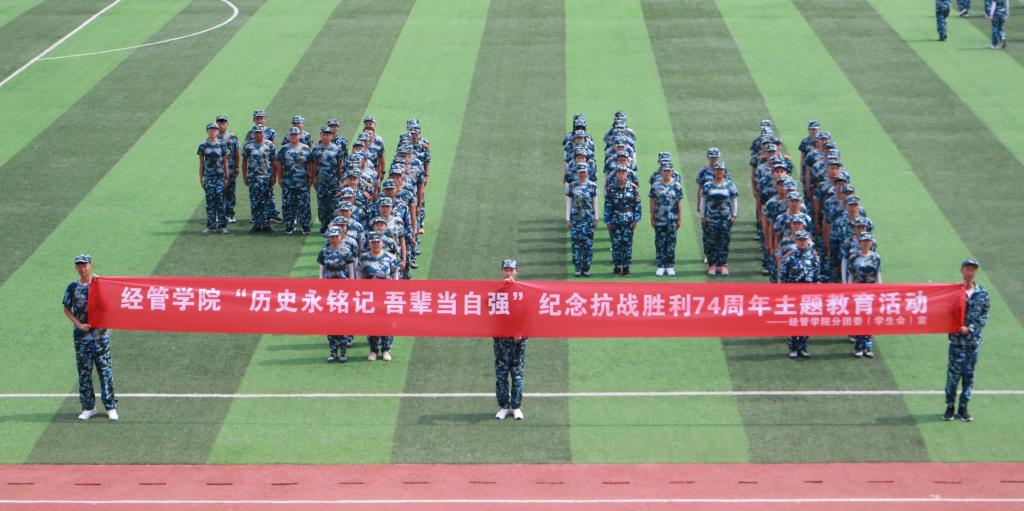 争做奋斗者,开学再出发。针对刚刚入学的大一新生,公司把思想引领教育放在首位,身着军训服的新生在操场上摆出“74”字样,纪念中国人民抗日战争胜利74周年。新生代表城管192班杨博表示“爱国主义始终在是亿万人民心中不变的旋律,也是广大青少年的必修课,我们要接力奋斗,把爱国主义的额热情转化为学习知识、报效祖国的不竭动力,在奋斗中书写无悔人生。”