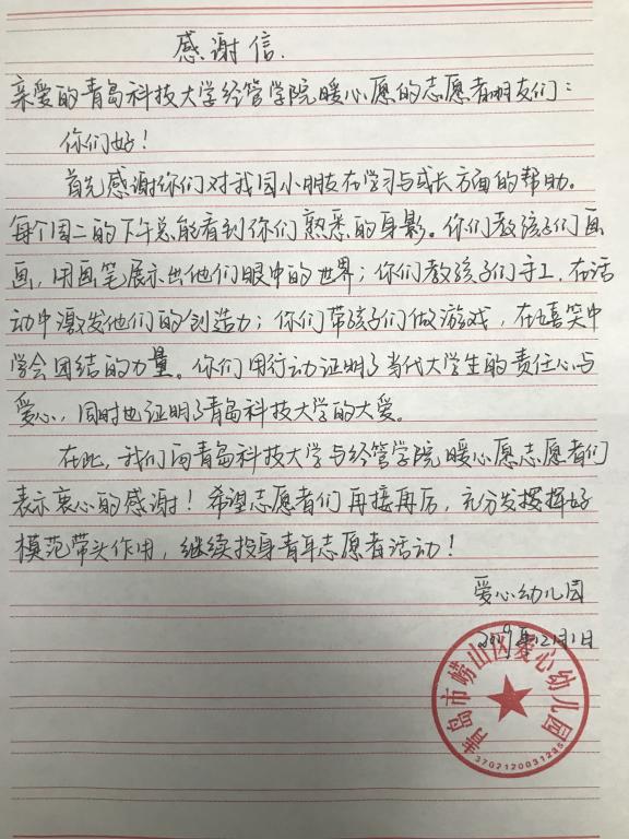 近日,青岛市崂山区爱心幼儿园给公司寄来了感谢信,对熊猫体育暖心愿志愿服务团队的志愿者们长期以来为爱心幼儿园送去的关爱和帮助给予了高度评价和衷心感谢。