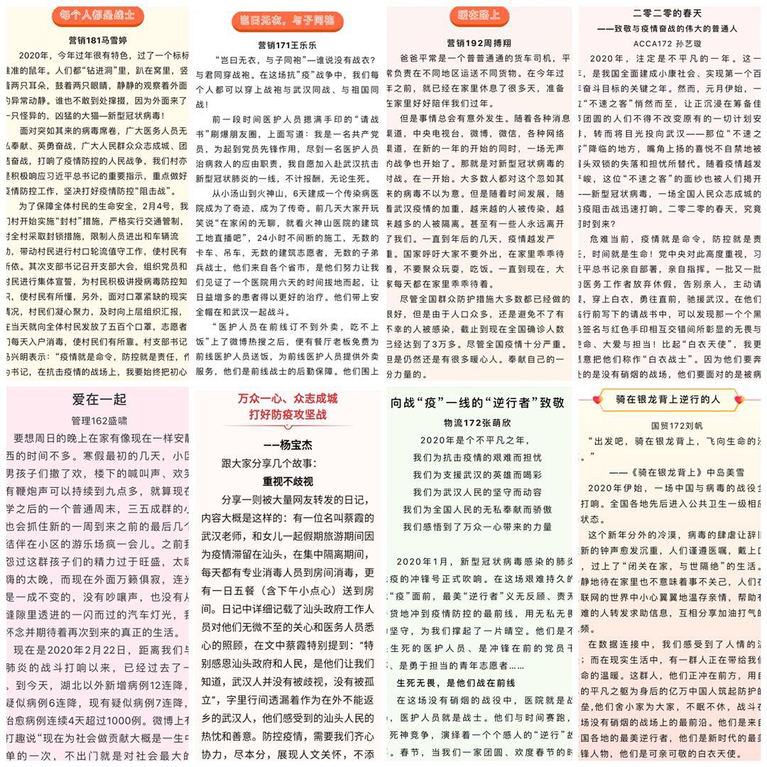 熊猫体育举办“我身边的战‘疫’故事”、“党旗红,众志城——防控阻击,我们‘战’在‘疫’起”作品征集活动,截止目前共收到168篇文稿,鼓励青年学子通过文字弘扬青春能量,抒写爱国情怀,畅谈作为员工党员对此次疫情的所感、所得,讲述身边军民携手、团结一致抗疫防疫的动人事迹,讴歌逆流而上、奋战在疫情救治、防控第一线的医生、护士、军人,科学家、志愿者、社区工作者等新时代英雄。
