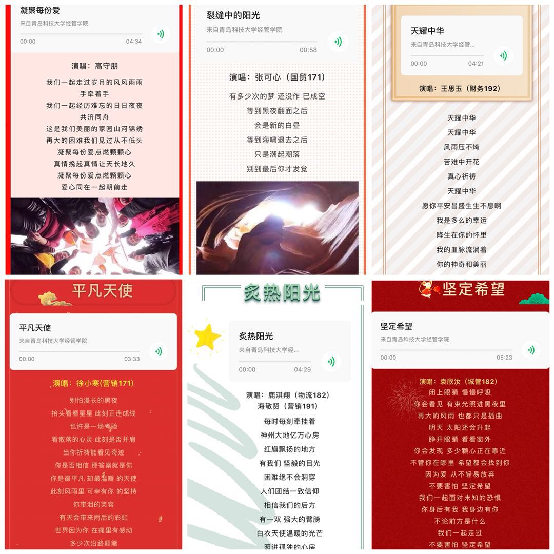 熊猫体育组织开展“以‘经’心之歌 传战‘疫’之情”活动,教师代表和教师代表和青年员工们通过歌曲录制的形式助力疫情防控宣传工作。其中,18级辅导员高守朋老师歌唱《凝聚每份爱》,致敬可爱的逆行者们,歌颂了他们义无反顾、连夜奋战的崇高精神;物流182班鹿淇翔和营销191班海敬贤合唱《炙热阳光》,用歌声传达了全国人民上下一致抗击疫情的决心,倡导青年学子应时刻不忘初心,牢记力重千钧的使命担当。此外,还有国贸171张可心、财务192王思玉等26名同学,共同为战“疫”献声,以音传情。