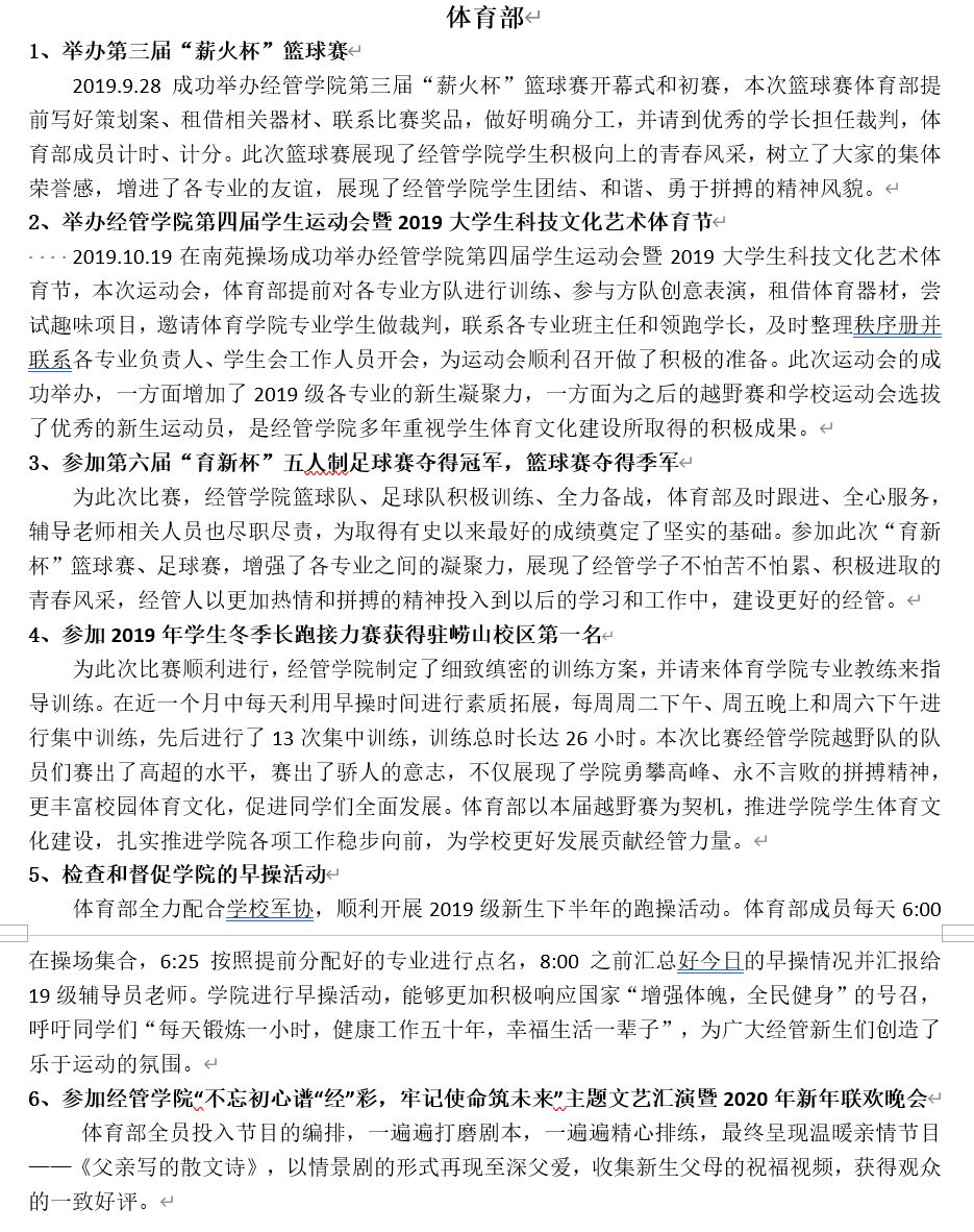 工作考核以部门为单位,分别从工作业绩和部门成员的学业成绩两个方面作为切入点,实行加减分制,结合上学期各个部门在部门建设、部门职能、部门管理等方面的表现进行评比,最终,严格按照部门评比细则,学术部摘得考核桂冠,秘书部和权益部以三分之差分列第二、第三,并授予其“先进工作部门”称号。同时,对于各部门综测成绩在前30%的成员授予“先进工作者”荣誉称号,按照奖罚分明原则,对在部门考核中位于后列的部门及部门成员施之惩罚,以促员工干部正确认识自己,发扬优点,弥补不足,提高工作效率,更好地发挥员工干部作用。