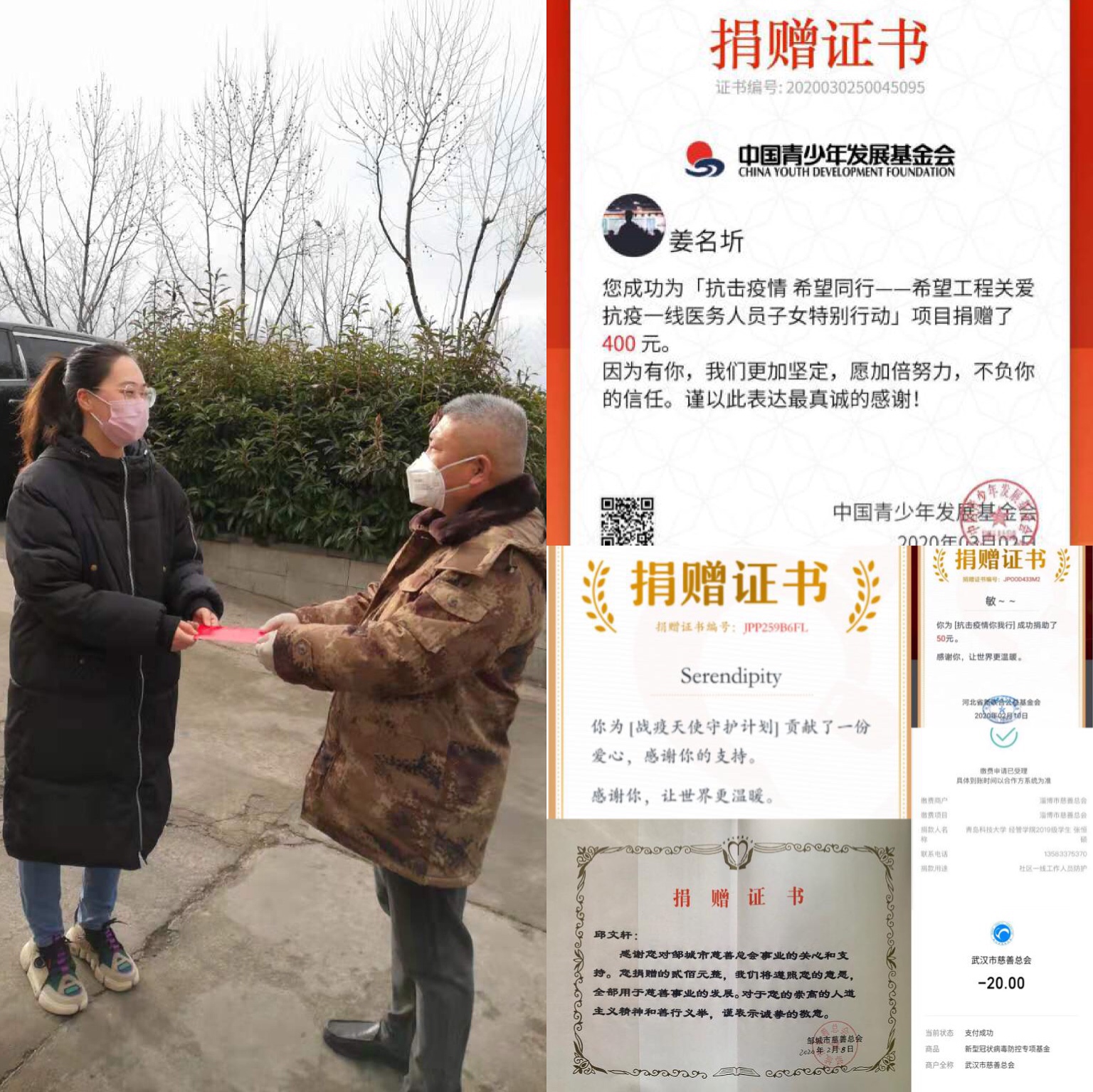 在这场战役中,人人都是参与者,人人都是见证者。财务管理(3+4)161班曲飞、财务181班邱文轩、营销162班韩苗苗、财务192班王心雨、营销192班阚晓敏、ACCA192班张恒硕等同学纷纷通过官方渠道积极参与到疫情防控捐款活动中,为抗击疫情贡献爱心。其中,担任熊猫体育崂山校区员工会执行委员会主任及城管171班长的姜名圻同学不仅主动捐款500元,并且号召全班同学根据自身情况为抗击疫情自愿捐款,带领同学提高责任意识、增强奉献精神。