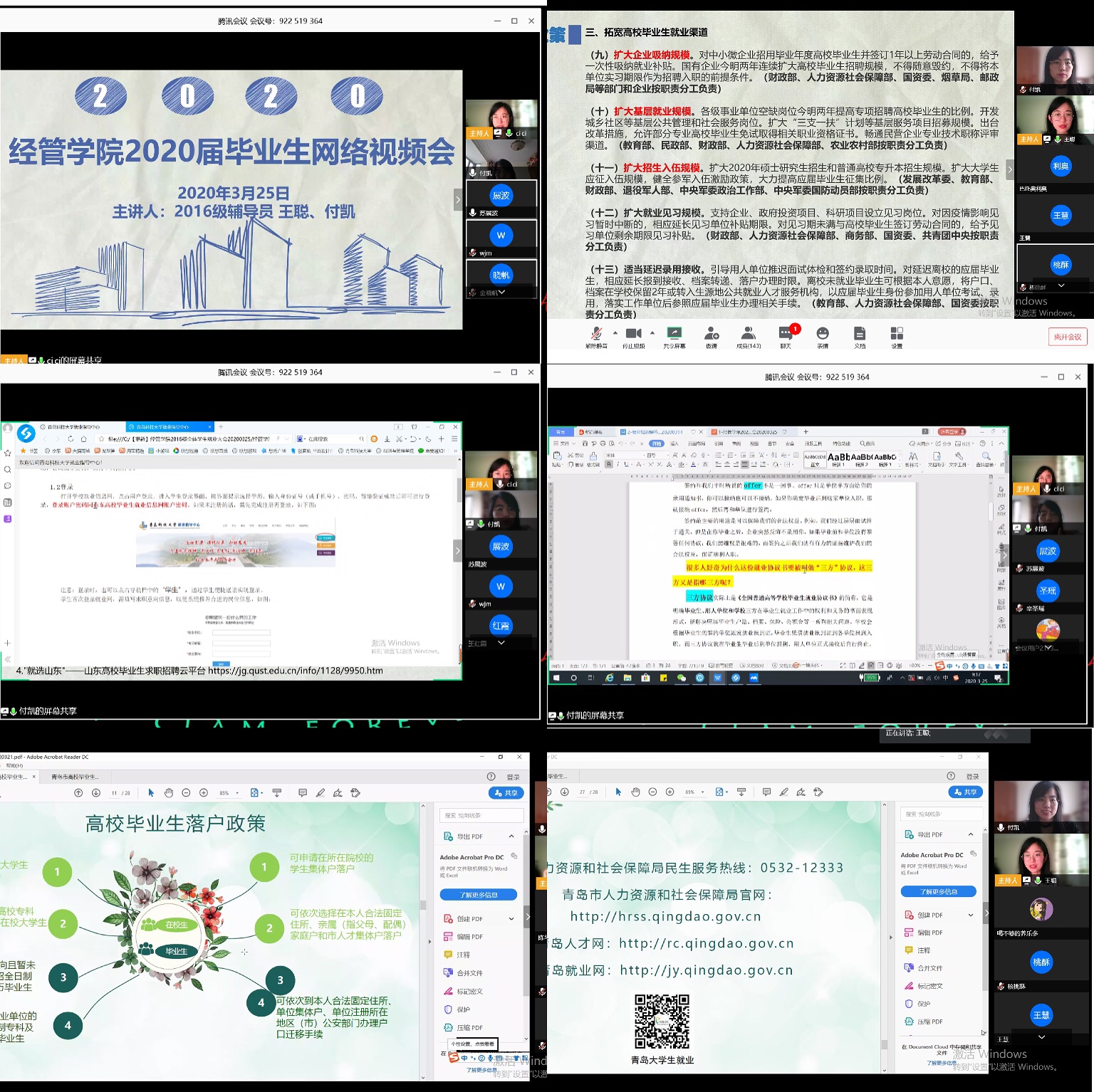 最后,王聪为同学们介绍了公司疫情期间对困难生、少数民族、湖北员工的就业帮扶举措,并针对考研复试和调剂准备,毕业论文撰写,答辩时间安排,成绩、学分确认,党团关系转接,毕业派遣,档案转出,报到证、毕业证及学位证领取等毕业相关事宜做出提醒和说明,同时,再次强调了疫情期间个人防护举措、禁止提前返校和安全信息的及时上报问题。此外,王聪就高校毕业生网络招聘平台、“青岛人社·学历汇”、高校毕业生落后及住房保障、高校毕业生就业、创业政策等五个方面进行就业政策解读,鼓励同学们充分知晓政策、用好政策、享受政策,高质量完成就业。