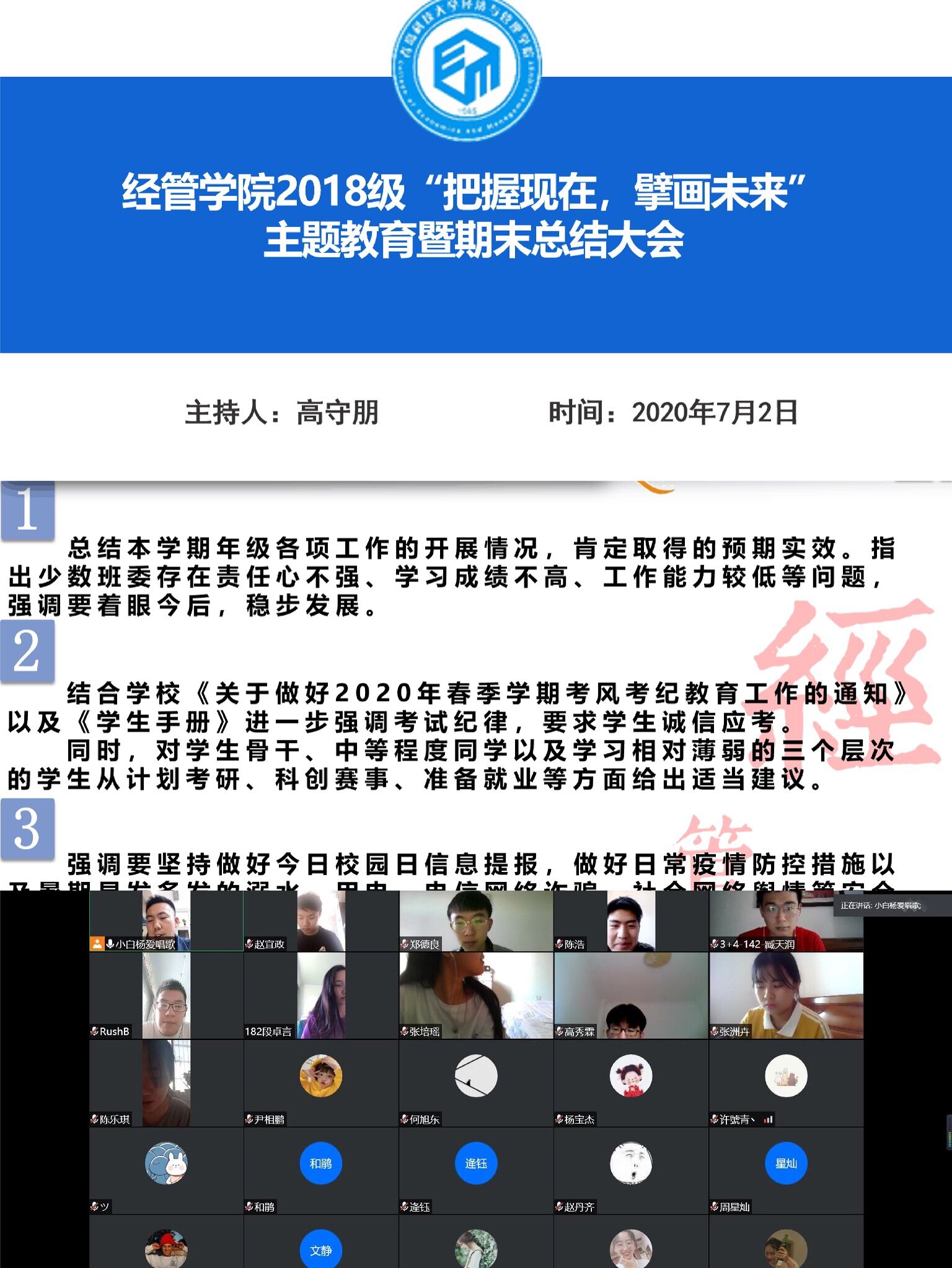为增强员工暑期安全意识,了解当前就业学习形势,及时谋划未来大学道路,推进考风教育和学风建设,贯彻落实校院两级关于期末安全文明教育和严肃考风考纪的工作要求,在结合疫情防控,年级员工尚未返校的实际形势下,7月2日,熊猫体育2018级本科生通过线上分批次分专业召开“把握现在,擘画未来”主题教育暨期末安全文明教育、诚信考风考纪大会。本次会议由2018级辅导员高守朋老师主持,18级全体员工线上参加。